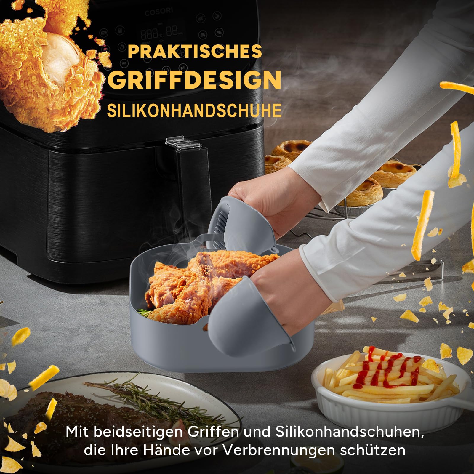 Und das Beste: Die Form ist nicht nur für die Fritteuse geeignet, sondern auch für Backofen und Mikrowelle. Sie ist spülmaschinengeeignet, zusammenfaltbar und spart dir jede Menge Backpapier. Inklusive hitzebeständiger Handschuhe - safety first!