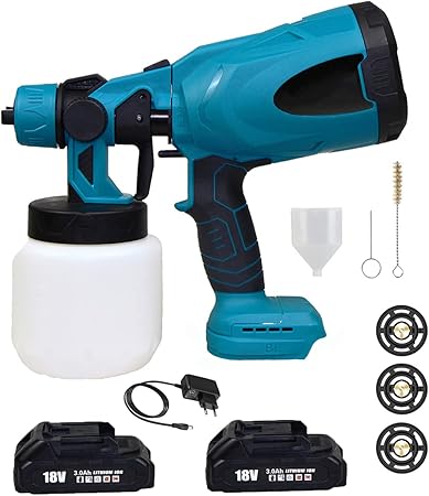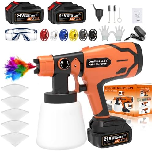 DIY-Fans, diese kabellose Farbsprühpistole ist der Hammer! Mit 21V und 30000 U/min sprühst du Wände, Zäune und Möbel super gleichmäßig. Inklusive 2x 3000mAh Akkus für langes Arbeiten.\n\n5 Metall-Düsen (0,8-2,5mm) und 3 Sprühmodi für jede Anwendung. 1000ml Behälter für große Flächen. Einfach Durchfluss und Mischverhältnis einstellen - von feinem Nebel bis kräftigem Sprühbild.\n\nWindschlitz-Design verhindert Überhitzung. Einfache Demontage ohne Werkzeug. Perfekt für Heimwerker die professionelle Ergebnisse wollen. Einfach aufladen und losspritzen!