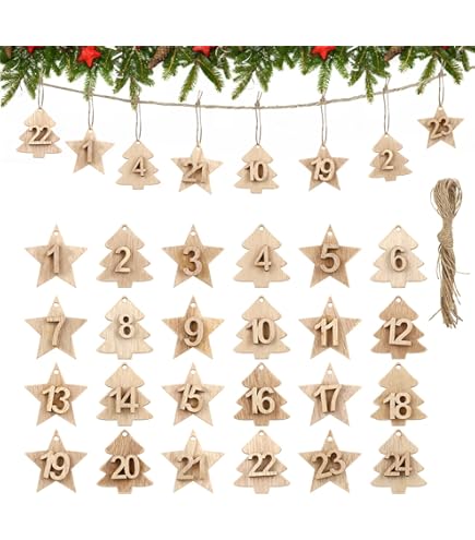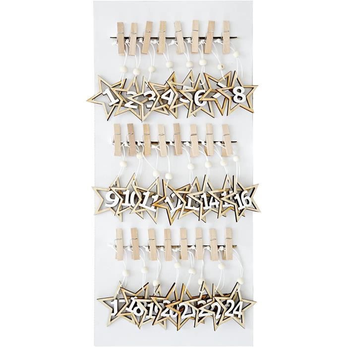 Oh, wie süß! Diese Holzklammern mit den goldenen Zahlen 1-24 und Sternen sind perfekt für selbstgemachte Adventskalender. Jede Klammer ist ca. 4,8 cm lang, der Stern 4 cm groß. Die Sterne gibt's in vier Farben: natur, elfenbein, orange und rot - also richtig bunt! Im Set sind auch weiße Baumwollschnur und Juteschnur zum Aufhängen dabei. Einfach die kleinen Päckchen, Säckchen oder Briefumschläge damit zuklammern und an die Schnur hängen. Super für Gutscheine, kleine Geschenke oder Süßigkeiten. Macht jedes Fenster, jeden Kamin oder jede Wand zur Advents-Kulisse! Die Klammern sind robust und kannst du Jahr für Jahr wieder verwenden. Auch toll für Kindergeburtstage im Dezember oder als Geschenk-Anhänger. Einfach deiner Kreativität freien Lauf lassen und individuelle Kalender basteln! Weihnachten kann kommen!