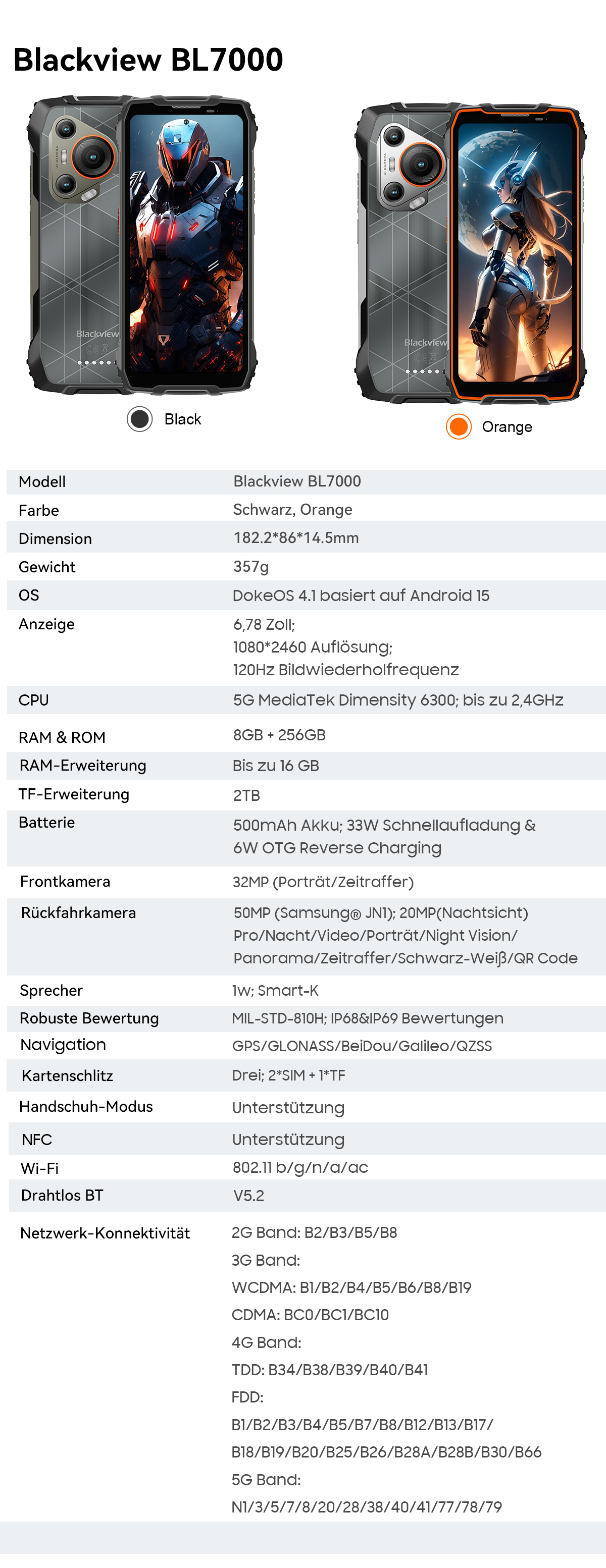Moin Outdoor-Fan! Das Blackview BL7000 ist das ultimative Robust-Handy für alle, die was erleben! Egal ob Baustelle, Bergtour oder Tauchgang - dieses Handy macht alles mit.\n\nKey Features:\n• 24GB RAM + 256GB ROM (erweiterbar auf 2TB!)\n• Riesiger 7500mAh Akku\n• IP68/IP69K - staub- & wasserdicht\n• 5G Support mit 32 Frequenzbändern\n• 6,78\ FHD+ Display mit 120Hz\n• 50MP Hauptkamera + 32MP Front\n\nPerfekt für:\n• Handwerker & Bauarbeiter\n• Outdoor-Sportler\n• Abenteurer & Reisende\n• Alle, die ein unkaputtbares Handy brauchen\n\nExtras:\n• Android 15 mit AI Features\n• Spracherkennung ohne Berührung\n• Doke AI Image App für Foto-Bearbeitung\n• MediaTek Dimensity 6300 Prozessor\n• NFC, GPS, OTG - alles dabei!\n\nOb auf der Baustelle, beim Klettern oder unter Wasser - dieses Handy hält durch, was andere nicht mal aushalten. Mit 33W Schnellladung (Adapter separat) bist du schnell wieder einsatzbereit!