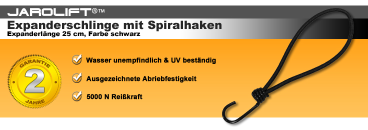 Für alle, die was zu verzurren haben! Die jarolift Expanderschlinge mit 25cm Länge und 6mm Durchmesser ist der perfekte Helfer für Transport und Sicherung. Der Spiralhaken aus Metall mit schwarzer Kunststoffummantelung schont Oberflächen, während die Sicherheitsklammer das Gummiseil bei starker Spannung sicher im Haken hält. Mit 5000 Newton Reißkraft ist die Schlinge extrem strapazierfähig - verstärkte Fasern machen sie besonders langlebig. Witterungs- und UV-beständig hält sie auch bei Outdoor-Einsätzen problemlos mit. Ob auf dem Anhänger, im Transporter oder bei der Lagerung - diese Expanderschlinge hält, was sie verspricht. Einfach zu handhaben, sicher in der Anwendung und für zahlreiche Einsatzzwecke geeignet. Qualität made in Germany - darauf kannst du dich verlassen!