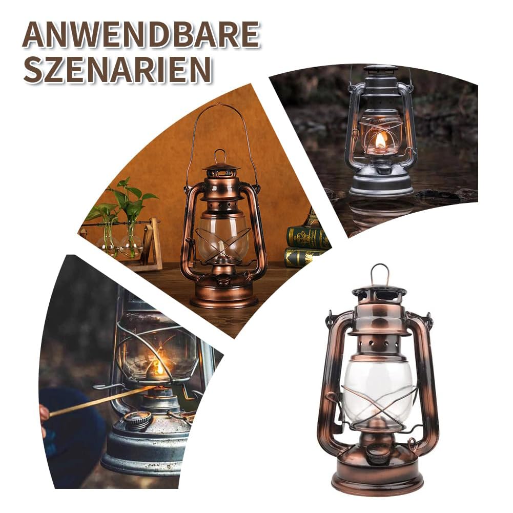 Alte Schule trifft auf praktischen Nutzen! Diese coole Retro-Sturmlaterne in Bronze bringt echtes Abenteuer-Feeling in dein Zuhause oder nächsten Camping-Trip. Mit 25cm Höhe ist sie handlich aber mit großem Tank - die Lampe brennt mehrere Tage lang! Aus feuerfestem Glas und robustem verzinktem Stahl gebaut, hält sie so einiges aus. Perfekt für gemütliche Abende im Garten, als Deko im Wohnzimmer oder als zuverlässige Lichtquelle beim Camping. Einfach mit Kerosin, Diesel oder Pflanzenkraftstoff befüllen (bitte nur zu 70% voll machen!) und schon geht's los. Achtung: Kein Benzin verwenden und immer auf feuerfestem Untergrund aufstellen. Ein super Geschenk für Outdoor-Fans, Camper oder alle, die vintage Flair lieben!