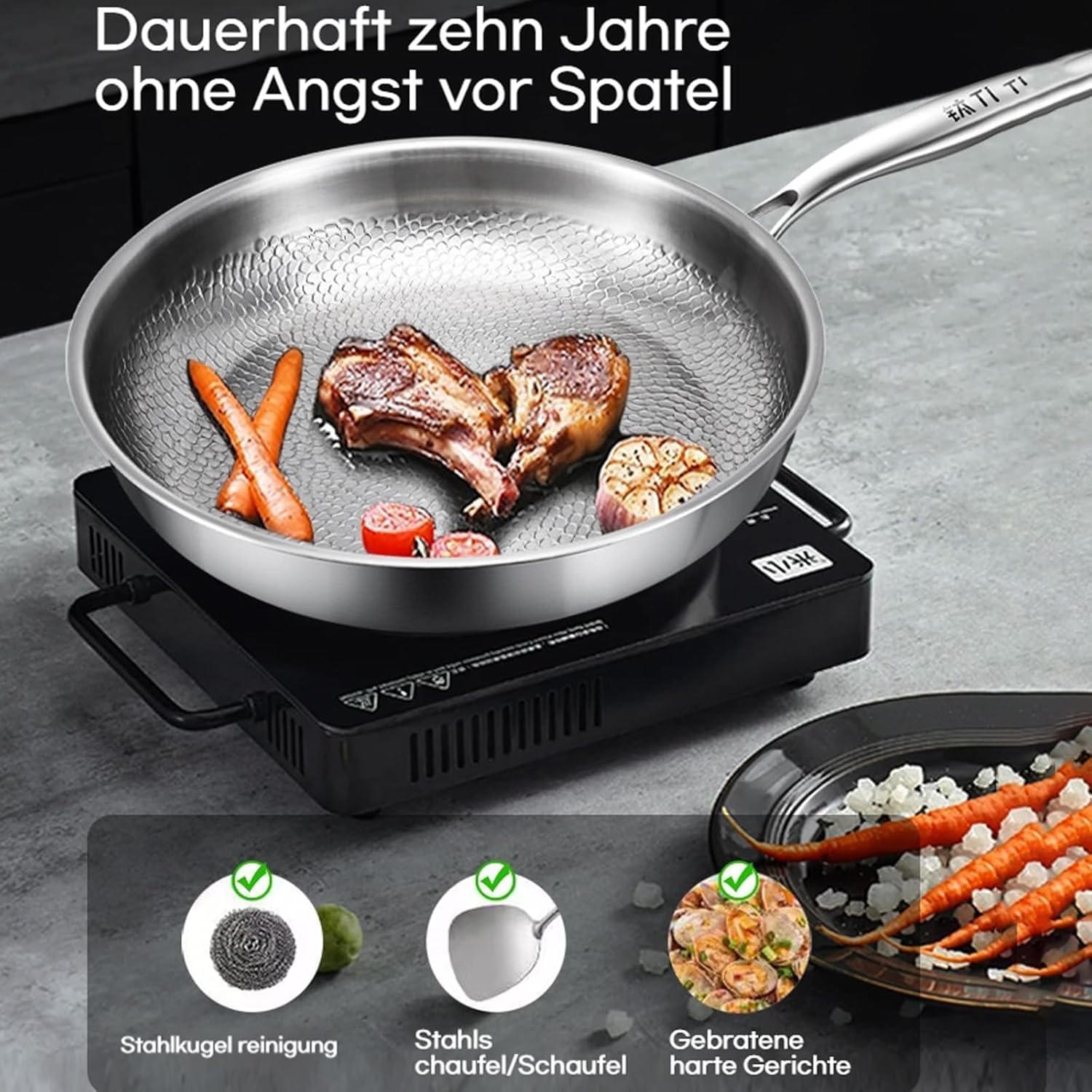 Kochbegeisterte aufgepasst! Diese Titan-Bratpfanne ist ein echter Game-Changer in der Küche. Mit 26cm Durchmesser und der natürlichen Antihaftwirkung brauchst du keine chemische Beschichtung - das Essen gleitet einfach so aus der Pfanne. Die gehämmerte Oberfläche sieht nicht nur stylisch aus, sondern sorgt auch für gleichmäßige Wärmeverteilung ohne lästige Hotspots. Hitzebeständig bis zu 548°C und geeignet für alle Herdarten inklusive Induktion! Mit nur 800g ist sie superleicht in der Handhabung. Einfach vor dem ersten Gebrauch ausspülen und schon kann's losgehen. Tipp: Am besten mit Holz- oder Silikonkochutensilien verwenden, dann hält die Pfanne ewig. Die entwickelt mit der Zeit eine natürliche Patina - das ist ganz normal und verbessert sogar die Antihaft-Eigenschaften. Perfekt für gesundes Kochen ohne Fett!
