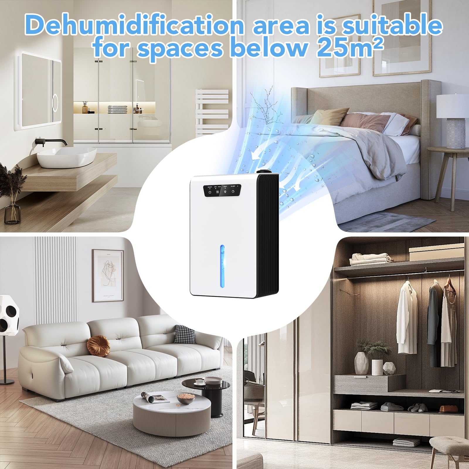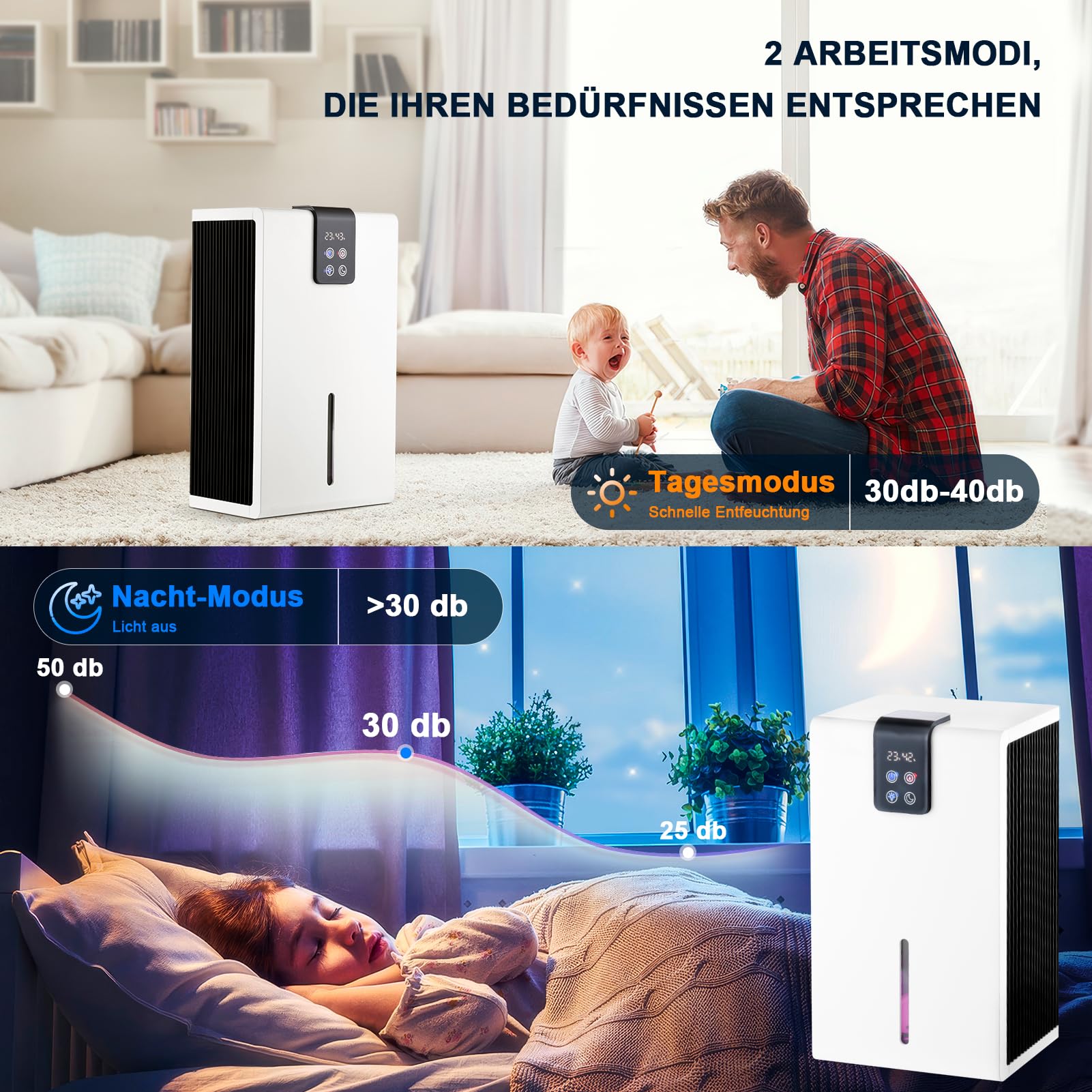 Schluss mit feuchter Luft und Schimmelgefahr! Dieser clevere Luftentfeuchter saugt bis zu 1000ml Wasser pro Tag aus der Luft und sorgt für ein angenehmes Raumklima. Mit seinem superleisen Schlafmodus (nur 27dB) störst du nachts garantiert nicht - perfekt fürs Schlafzimmer. Der große 2L-Tank muss selten entleert werden, oder du schließt einfach den Ablaufschlauch für Dauerbetrieb an. Das intuitive LED-Display und die einfache Bedienung machen die Nutzung zum Kinderspiel. Mit Timer-Funktion für 8, 16 oder 24 Stunden sparst du zusätzlich Energie. Die 5 Farblichter schaffen eine gemütliche Atmosphäre - wähl deine Lieblingsfarbe oder genieße den sanften Farbwechsel. Für Räume bis 60m² ideal - ob im Bad, Keller oder Büro. Energieeffizient mit nur 1,92kWh pro Tag ist er nicht nur effektiv, sondern auch umweltfreundlich. Einfach anschalten und sich über trockene, frische Luft freuen - deine Möbel und deine Gesundheit werden es dir danken!