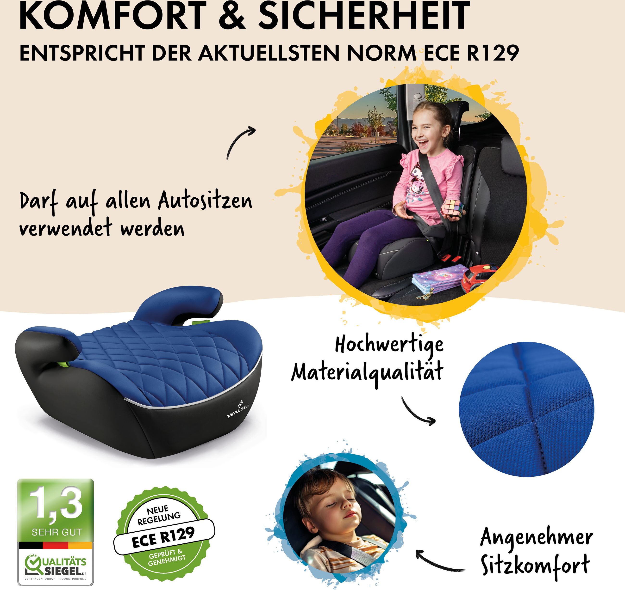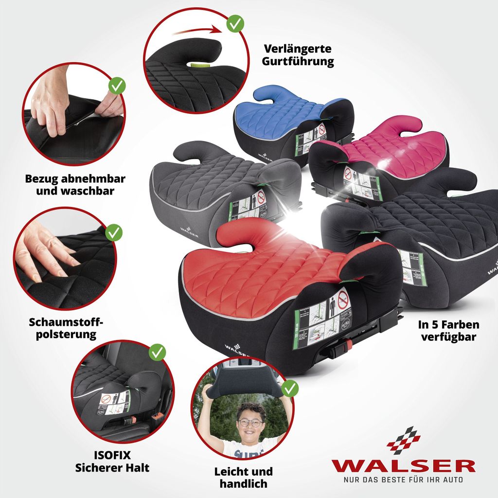 Perfekte Sitzerhöhung für deine Kids im Auto! Dieses WALSER Andy Set kommt mit 2 Stück - ideal für Geschwister oder als Ersatz. Entspricht der neuesten Norm ECE R129 (nach Körpergröße 125-150cm, nicht mehr nach Gewicht). Die ergonomische Form sorgt für super Sitzkomfort, auch bei langen Fahrten. Mit verlängerten Seitenflügeln für optimalen Halt und Schutz. Die praktische grüne Gurtführung macht das Anschnallen ganz einfach. Maße: 36,5x44x22cm, passt in die meisten Autos mit Dreipunktgurt. Nur 1,2kg schwer - super handlich zum Transportieren. Bezug aus 100% Polyester, abnehmbar und bei 40°C waschbar. Von Qualitätssieger mit 'Sehr Gut' bewertet! Einfach reinsetzen, anschnallen und sicher unterwegs. Deine Kinder werden den Komfort lieben!