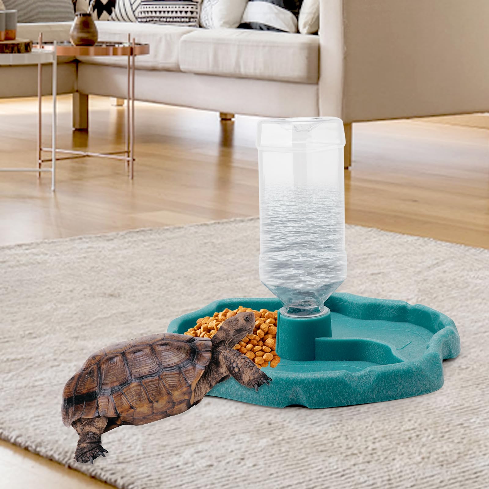 Hey Reptilien-Fans, dieser 2in1 Futternapf ist ja mal genial praktisch! Mit 21x19,5x2cm perfekt für Schildkröten, Echsen und andere kleine Reptilien. Aus sicherem ABS-Kunststoff der nicht umkippt und rutschfest steht. Das coole Feature: Der automatische Wasserspender! Einfach die Flasche mit Wasser füllen und schon wird die Schale kontinuierlich nachgefüllt - dein Tier hat immer frisches Wasser. Eine Flasche reicht für etwa eine Woche! Zwei separate Bereiche für Futter und Wasser, alles leicht zu reinigen. Die himmelblaue Farbe sieht natürlich aus und passt in jedes Terrarium. Ideal für Schildkröten, Bartagamen, Frösche und mehr. Mach die Fütterung deiner Lieblinge einfacher und hygienischer!