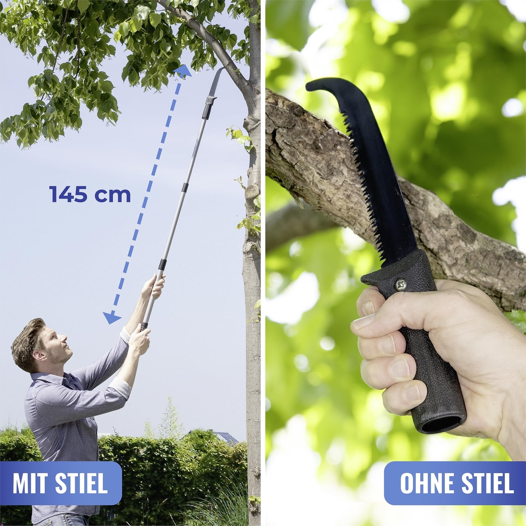Schluss mit wackeligen Leitern! Die NovaTerra Astsäge mit Teleskopgriff macht die Baumpflege zum Kinderspiel. Das praktische 2-in-1-System kombiniert eine scharfe Säge für dickere Äste mit einer Astschere für Äste bis 30mm Durchmesser. Der stufenlos verstellbare Teleskopgriff erreicht bis zu 3.4m Höhe - so kommst du auch an die höchsten Äste problemlos ran. Einfach die Stange gegen den Uhrzeigersinn drehen zum Entsperren, auf die gewünschte Länge ausziehen und wieder fixieren. Die ergonomischen Griffe liegen perfekt in der Hand, und die robusten Sägeblätter sorgen für saubere, präzise Schnitte. Für die Astschere einfach den Ast umklammern und den Kunststoffgriff an der Kordel nach unten ziehen. Leicht, handlich und extrem effektiv!