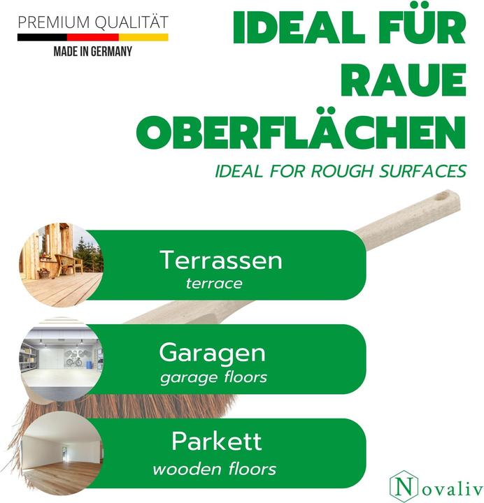 Deutsche Qualität für draußen! Zwei robuste Handfeger mit 60cm langem Stiel aus Buchenholz. Die 4-reihigen Elaston-Borsten sind extra hart, waschbar und für groben Schmutz geeignet. Perfekt für Terrasse, Hof oder Garage. Mit Aufhänge-Loch für praktische Aufbewahrung. Vegan und wetterfest - hält auch bei Nässe. Aus einer deutschen Traditionsbürstenfabrik. Mach deine Outdoor-Reinigung kinderleicht!