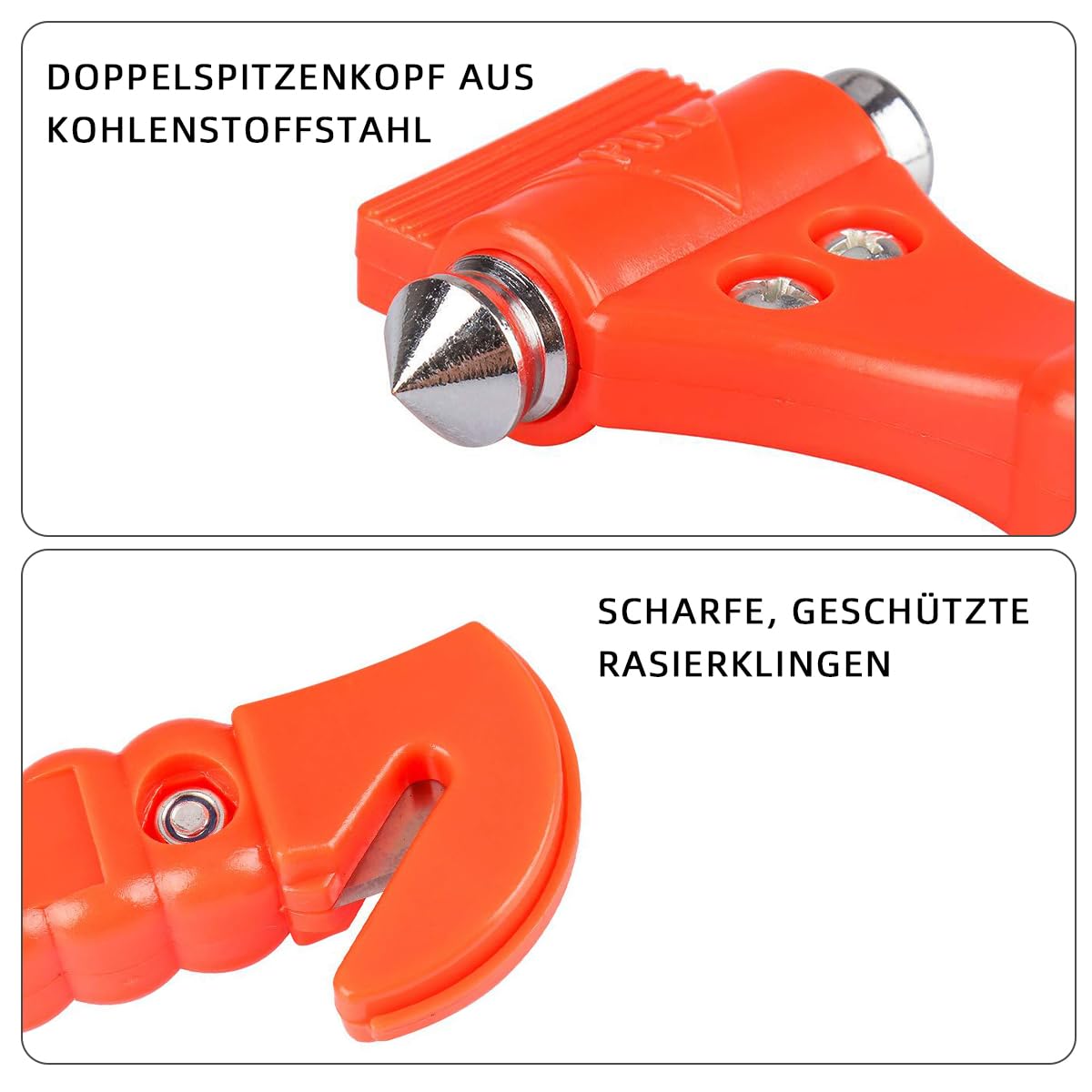 Sicherheit geht vor - mit diesen praktischen 2-in-1 Nothammern bist du für den Ernstfall bestens gerüstet! Jeder Hammer kombiniert einen effektiven Fensterbrecher mit einem scharfen Gurtschneider. Aus robustem Wolframstahl gefertigt, sind sie extrem langlebig und verformen sich nicht bei Gebrauch. Das Geniale: Schon mit nur 12 lbs Druck zerbricht der Glasbrecher mühelos gehärtetes Autoglas. So klein und handlich, dass sie perfekt an den Schlüsselbund passen oder in der Handschuhbox verstaut werden können. Im Set sind zwei Stück enthalten - ideal für beide Vordersitze. Egal ob für Auto, Bus oder Wohnmobil - dieses Sicherheitswerkzeug kann im Notfall Leben retten. Einfach zu bedienen für Erwachsene, Senioren und sogar Kinder. Ein unverzichtbares Accessoire für jedes Fahrzeug!