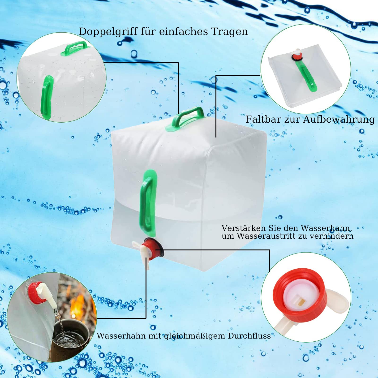 Perfekt für Outdoor-Abenteuer! Dieses Set mit 2 faltbaren 5-Liter-Wasserkanistern gibt dir insgesamt 10 Liter Wasservorrat. BPA-frei und super leicht - jeder Kanister wiegt leer nur 72 Gramm!\\n\\nMit praktischem Hahn für kontrolliertes Abfüllen und geformten Griffen für bequemen Transport. Die breite Öffnung (3,5 cm) macht das Nachfüllen super einfach.\\n\\nFeatures:\\n• Steht stabil wenn gefüllt\\n• Faltet sich flach zusammen wenn leer\\n• 2 Farben (transparent + blau)\\n• Einfache Identifikation\\n• Wiederverwendbar\\n\\nIdeal für Camping, Festivals, Picknicks, Strandtage oder als Notfallvorrat. Ein britisches Unternehmen steht für Qualität. Einfach zusammenfalten, einpacken und los geht's Abenteuer!