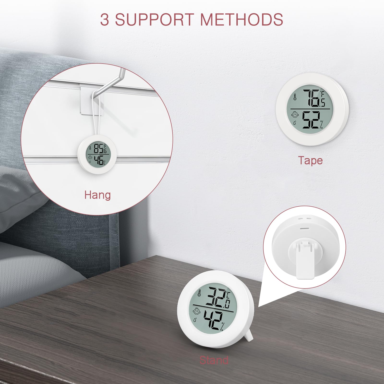 Immer das perfekte Raumklima! Dieses digitale Thermometer-Hygrometer zeigt dir Temperatur und Luftfeuchtigkeit genau an. Mit großem 3,2 Zoll LCD Display siehst du alles auf einen Blick. Wechsel einfach zwischen ℃ und ℉ je nach Vorliebe. Zeigt zusätzlich Uhrzeit und Datum an - praktisch für jeden Raum. Daten werden alle 10 Sekunden aktualisiert für Echtzeit-Messungen. Kann aufgestellt, an die Wand gehängt oder geklebt werden. Perfekt für Schlafzimmer, Wohnzimmer, Büro oder Gewächshaus. Mit CR2032 Batterie inklusive. Maße: 8x7x1cm • Messbereich: -10℃ bis 60℃ • Luftfeuchtigkeit: 10-99% RH