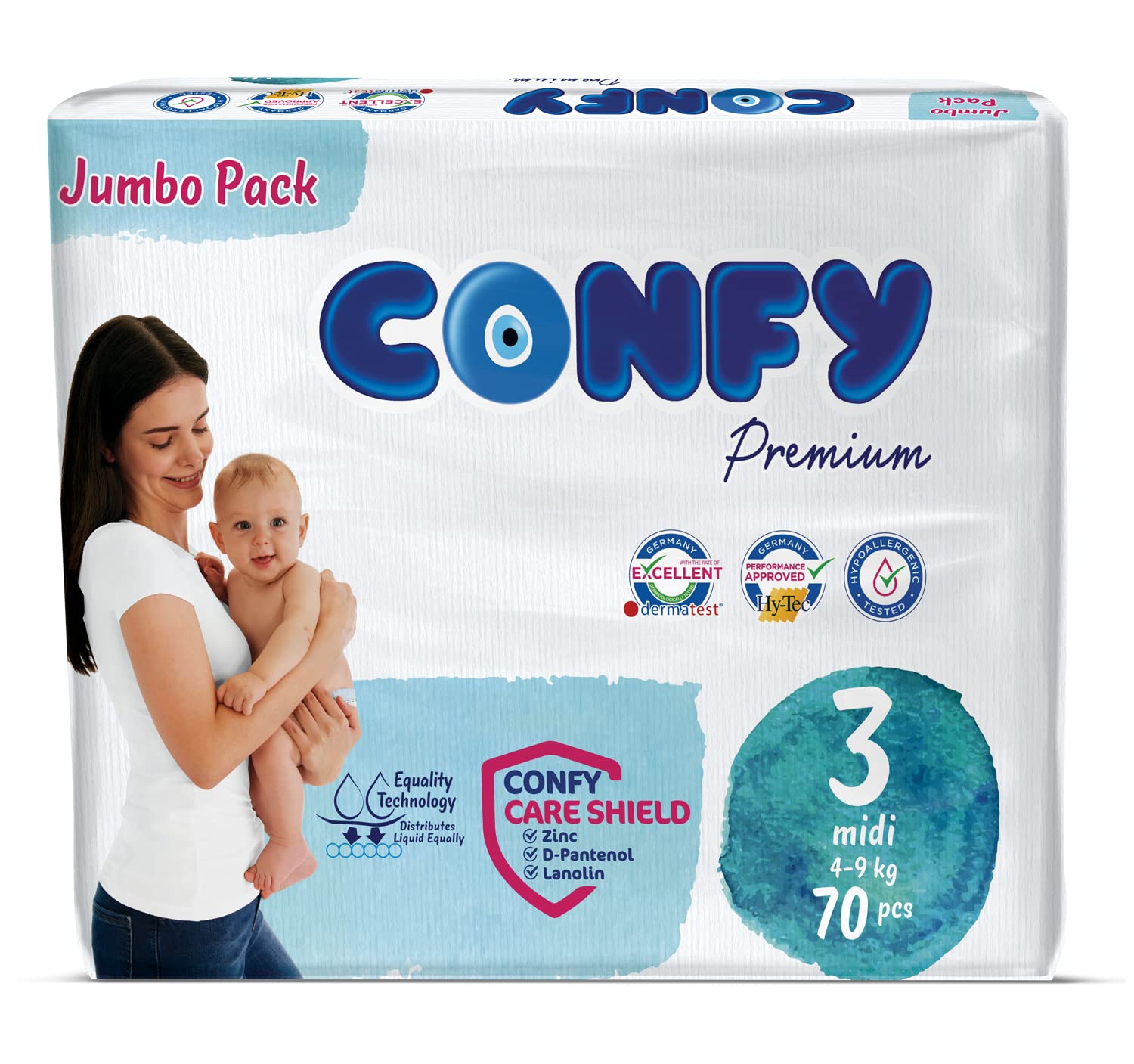Oh, für dein Kleines ab 4-9 kg sind diese Confy Windeln genau das Richtige! Die Größe 3 im Jumbo-Pack mit 70 Stück spart dir häufiges Nachkaufen und ist perfekt für den Alltag. Mit dem Rundum-Auslaufschutz an den Seiten bleibt alles trocken – auch nachts. Die Windeln haben eine super weiche 3D-Baumwolloberfläche, die sich an die Haut anschmiegt, und sind atmungsaktiv, damit dein Baby nicht schwitzt. Besonders toll: Die Schutzschildtechnologie mit Zink, D-Panthenol und Lanolin pflegt die Haut, beruhigt sie und hilft bei kleinen Reizungen. Dazu kommen pflanzliche Inhaltsstoffe wie Aloe Vera, Süßmandel und Olivenöl für extra Zärtlichkeit. Und das Beste: Die Windeln sind parfum- und parabenfrei, dermatologisch getestet und zertifiziert. So bleibt dein Liebling happy und trocken, und du hast ein gutes Gefühl. Einfach wechseln und strahlen sehen!