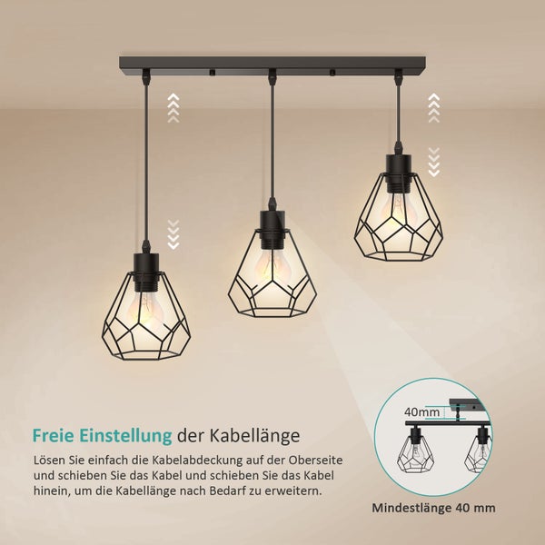 Boah, diese 3-flammige Hängelampe im Vintage-Industrial-Look ist einfach nur genial! Die schwarzen Drahtgeflecht-Schirme werfen super coole Licht-Schatten-Effekte. Mit E27 Fassungen für bis zu 60W pro Birne (nicht im Lieferumfang) und verstellbarer Höhe passt sie perfekt über Esstisch, Kücheninsel oder im Wohnzimmer. Das Metall-Gehäuse rostet nicht und ist leicht zu reinigen. Ob für Retro-Fans oder Industrial-Liebhaber - diese Lampe macht jeden Raum zum Eyecatcher! Einfach aufhängen, Birnen rein und staunen, wie viel Atmosphäre gutes Licht schaffen kann!