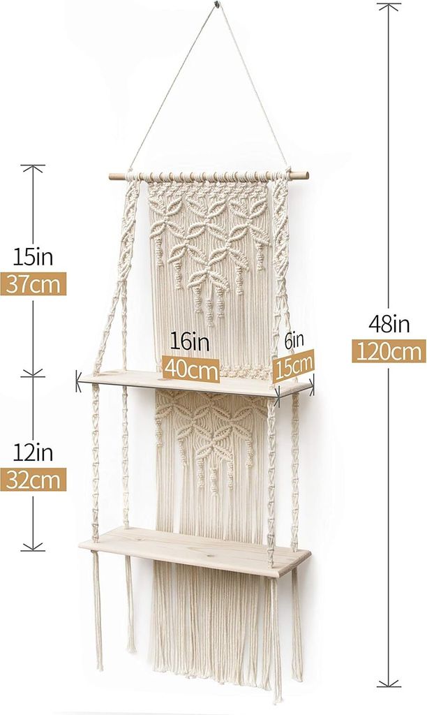 Boheme-Flair für deine Wände! Dieses stylische 3-lagige Hängeregal im Boho-Design besteht aus Massivholz und Baumwollseilen. Jedes Holzbrett misst 36x14x1cm, die Gesamthöhe von 92cm ist durch verstellbare Seile anpassbar. Perfekt für die Präsentation von Pflanzen, Fotos, Büchern oder Deko-Artikeln. Einfach zu montieren - im Set enthalten: 3 Holzbretter, 3 Haken und 3 Schrauben. Passt zu rustikaler, unkonventioneller oder minimalistischer Einrichtung. Ideal für Wohnzimmer, Schlafzimmer, Badezimmer oder Büro. Schafft praktischen Stauraum ohne viel Platz zu beanspruchen. Ein tolles Geschenk für Wohnaccessoire-Liebhaber. Einfach anbringen, deine Lieblingsstücke arrangieren und den neuen Boho-Look genießen. So bringst du Natur und Stil in dein Zuhause!