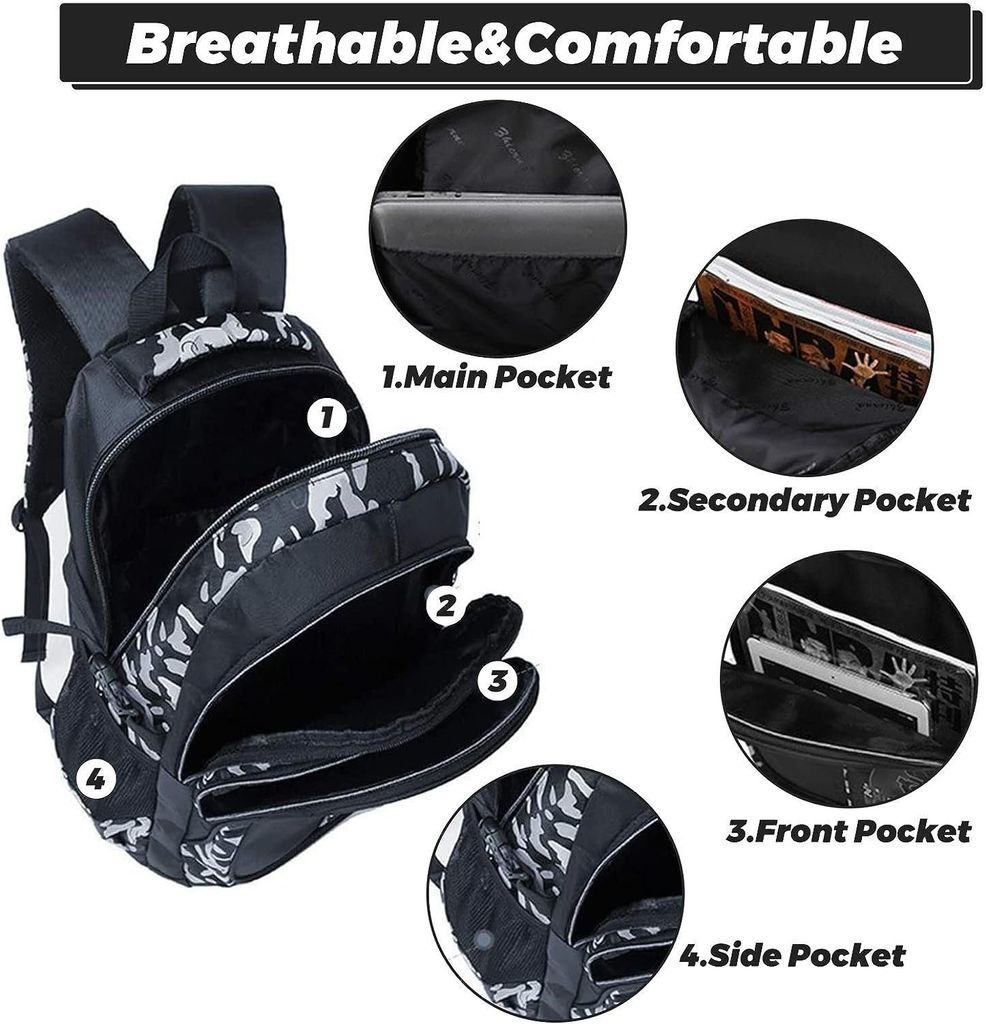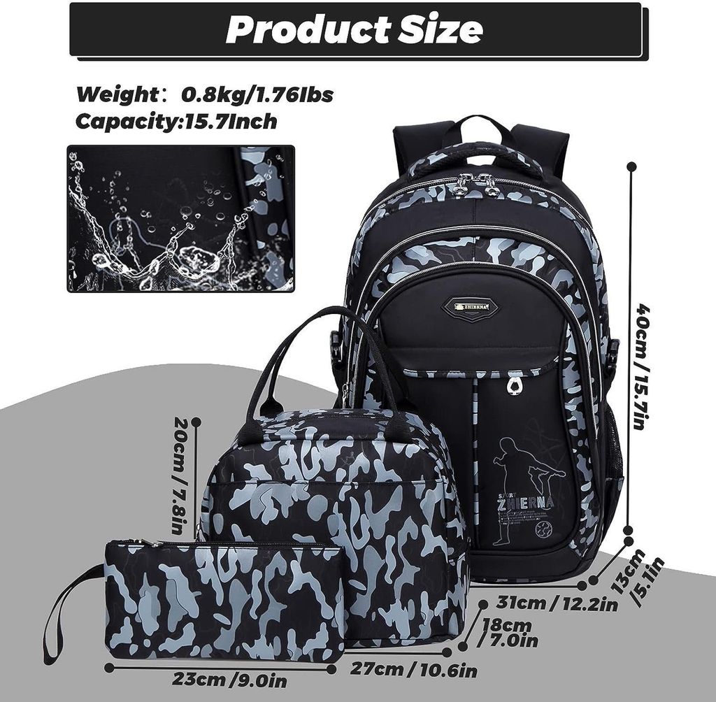 Das komplette Set für die Schule! Dieser 18-Zoll-Rucksack (47x33x18cm) hat Platz für alles: Bücher, Hefte, sogar Laptops bis 15,6 Zoll. Dazu gibt's eine isolierte Lunchbox, damit das Pausenbrot frisch bleibt, und ein Federmäppchen für Stifte & Co. Aus robustem Polyester, der wasserabweisend ist und nicht verblasst. Mit atmungsaktiven, gepolsterten Trägern, die auch bei vollem Packen bequem sitzen. Mehrere Fächer und Seitentaschen für Trinkflasche und Regenschirm - alles hat seinen Platz. Perfekt für Grundschule, Mittelstufe, aber auch für Ausflüge und Camping. In coolen Designs, die Jungs lieben werden. Einfach das perfekte Geschenk zum Schulstart, Geburtstag oder Weihnachten!