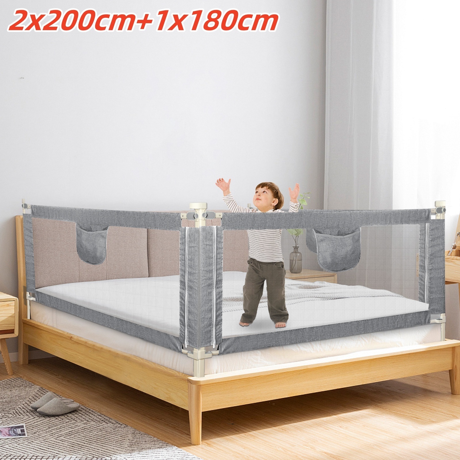 Hey Eltern! Damit eure Kleinen sicher schlafen, ist dieses 3-teilige Bettgitter-Set perfekt. Im Bundle sind zwei 200cm und ein 180cm Gitter - ideal für Kingsize-Betten oder große Matratzen. Die Montage geht ratzfatz: Innerhalb von 3 Minuten sind die vormontierten Gitter einsatzbereit! Einfach Stützbasis und U-förmige Basis verbinden und ans Bett befestigen. Das besondere 25-stufige Höhenverstellungssystem mit Doppelknopfschalter passt sich jeder Matratzenhöhe von 5-26cm an. So kann euer Kind die Gitter nicht selbst runtermachen. Die U-förmige Basis gibt extra Stabilität und verhindert Rutschen. Das atmungsaktive Netzgewebe sorgt für gute Luftzirkulation und ihr könnt euer Baby immer im Blick behalten. Besonders praktisch: Das doppelseitige Kindersicherungsdesign ermöglicht einfaches Ein- und Aussteigen. Einfach Knopf drücken, Gitter runterklappen und schon kommt man bequem ins Bett. Mit den süßen Motiven Stern, Elefant und Mond wird's auch noch hübsch anzusehen! Vor dem Kauf bitte Bettgröße checken - dann steht dem sicheren Schlaf nichts mehr im Weg.