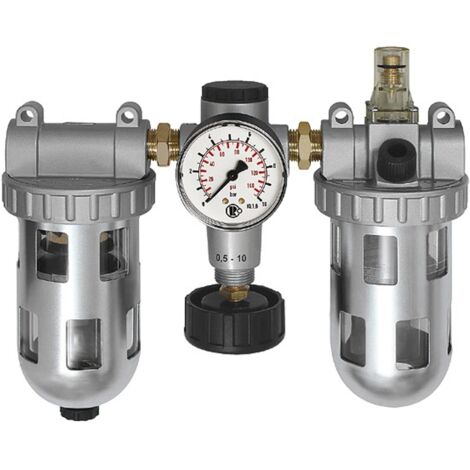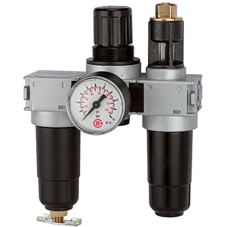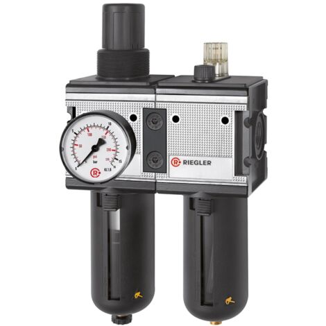 Professionelle Druckluft-Aufbereitung! Diese RIEGLER 3-teilige Wartungseinheit hat alles was du brauchst: Druckregler, Filter und Öler in einem. Für max. 16bar Eingangsdruck.