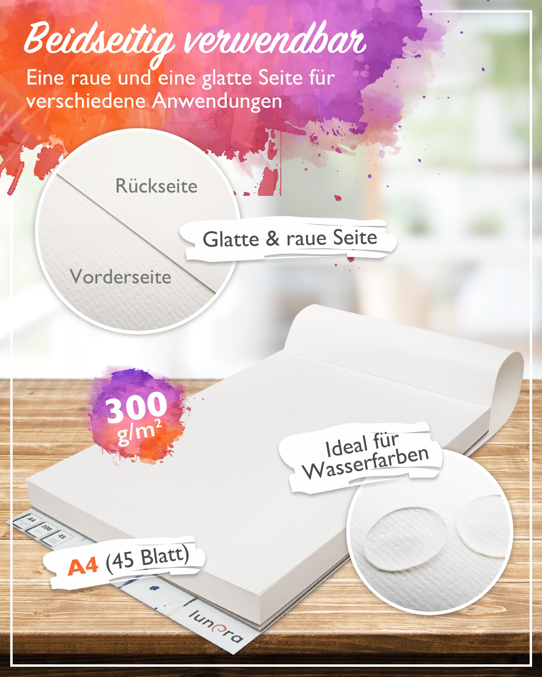 Für alle, die gerne mit Wasserfarben malen: Dieser Aquarellblock von Atliberswo ist genau das richtige! 30 Blätter im praktischen A4-Format (21x29,7 cm) mit ner ordentlichen Stärke von 300g/m². Das bedeutet: Das Papier wellt sich nicht, selbst wenn du es richtig nass machst - perfekt also für Aquarell, Gouache oder Acryl. Die Baumwollmischung sorgt für brilliant leuchtende Farben und kontrollierte Farbverläufe. Egal ob du Nass-in-Nass-Techniken ausprobierst oder mehrschichtig arbeitest - das Papier macht alles mit. Auch für Tinte, Tusche oder als Skizzenpapier super geeignet. Die Blätter sind in Archivqualität, deine Kunstwerke bleiben also lange schön. Mit 30 Blättern im Block hast du genug Material für mehrere Projekte, Kurse oder einfach zum täglichen Üben. Viel besser als Einzelblätter zu kaufen - sparst du noch Geld dabei!
