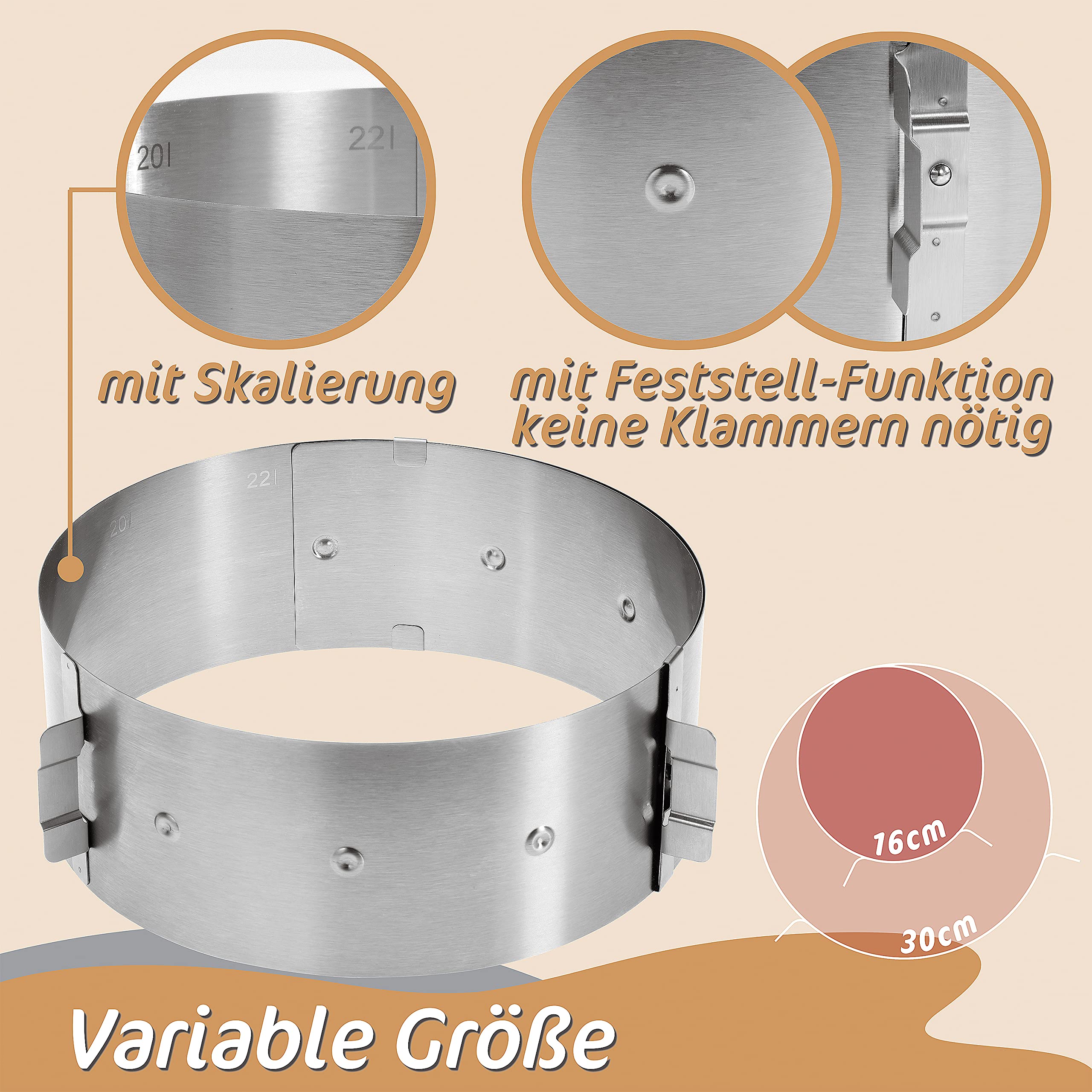 Der ultimative Tortenring für perfekte Kuchen! Verstellbar von 16-30cm Durchmesser - ersetzt viele einzelne Formen. 20cm hoch, aus rostfreiem Edelstahl. Mit Skala und Klemmhebel für stabile Fixierung. Spülmaschinengeeignet und hitzebeständig bis 560°C. Einfach zu öffnen - Torte löst sich perfekt. Ideal für Käsekuchen, Torten, Mousse und mehr. Für Hobbybäcker und Profis!
