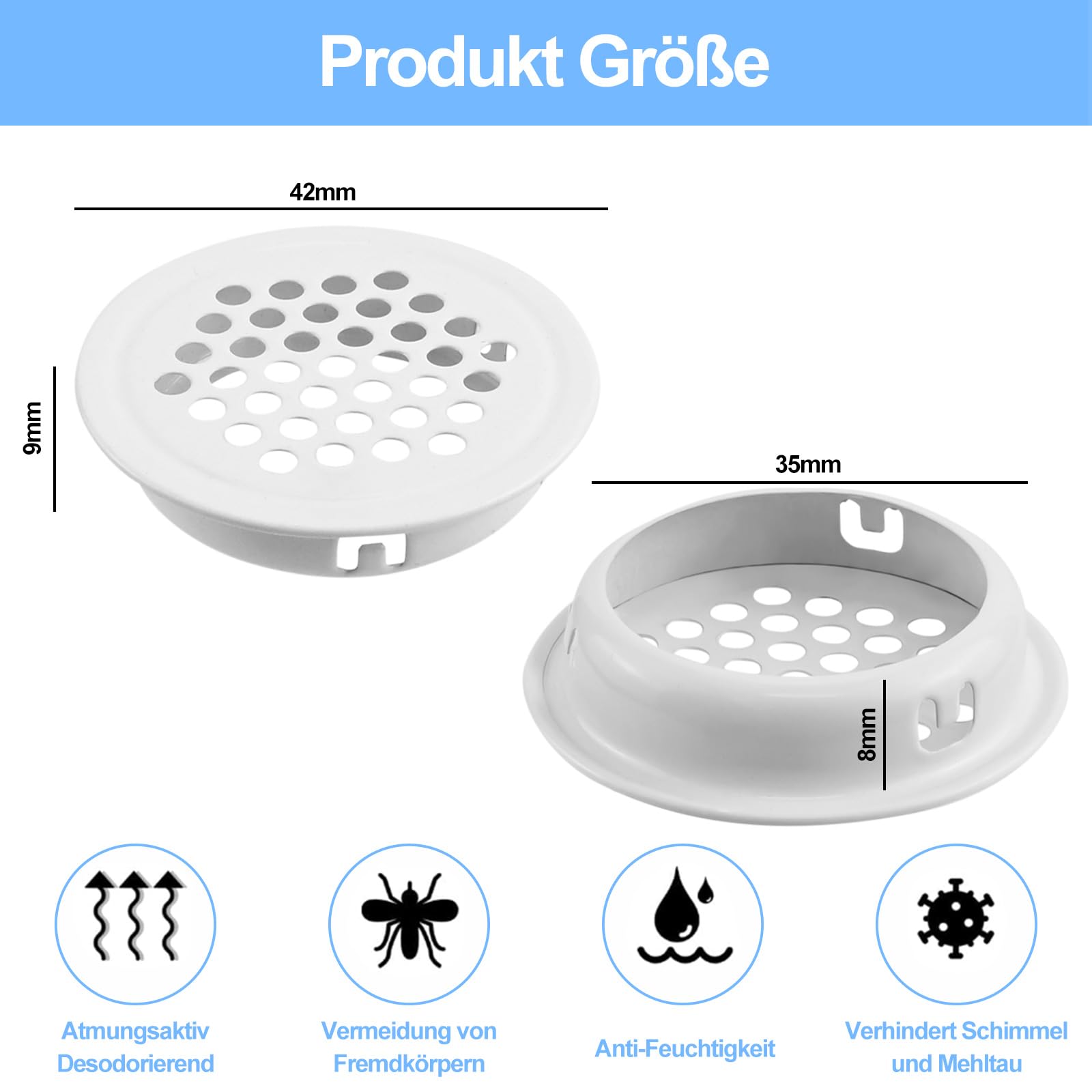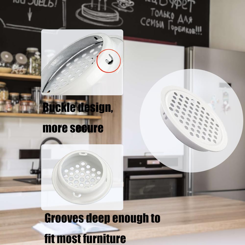 Endlich frische Luft in deinen Schränken! Diese 35 mm runden Lüftungsgitter aus Edelstahl 304 sorgen für perfekte Belüftung und verhindern muffige Gerüche und Schimmel. Die feine Wabenstruktur hält lästige Insekten wie Motten und Mücken draußen, lässt aber genug Luft durch für ein gesundes Raumklima. Das praktische Snap-on-Design macht die Montage zum Kinderspiel - einfach in das vorgebohrte Loch drücken und schon sitzt es fest. Ohne Werkzeug, ohne Kleber, in Sekunden erledigt! Die weiße Farbe und das schlichte Design fügen sich dezent in jeden Möbelstil ein - ob moderner Kleiderschrank, rustikale Kommode oder praktischer Weinschrank. Mit 20 Stück im Set hast du genug für mehrere Möbelstücke oder zum Aufbewahren für spätere Projekte. Die abgerundeten Kanten sind sicher und verletzen nicht. Aus hochwertigem, rostbeständigem Edelstahl - hält ewig und sieht immer gut aus. Einfache Lösung für ein häufiges Problem in Haushalt und Büro!