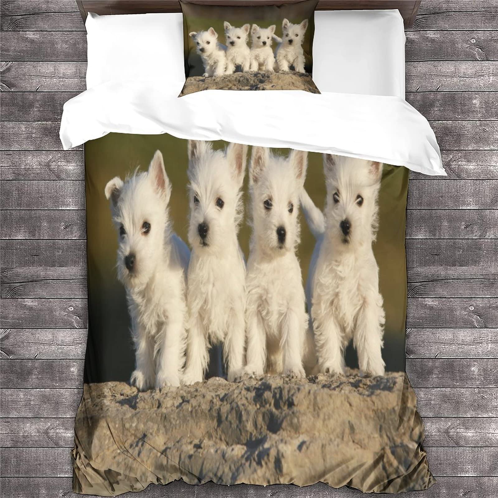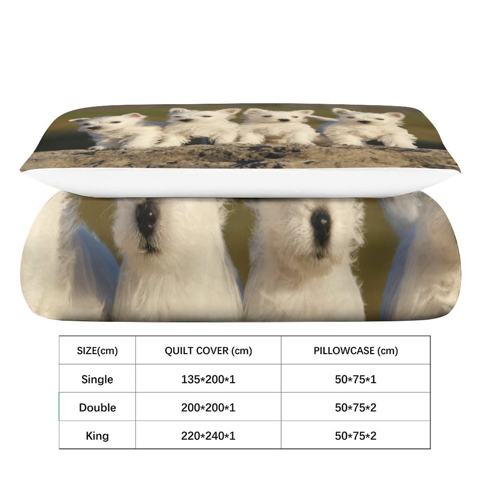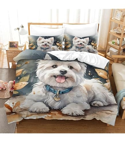 Oh wie süß! Diese West Highland Terrier Bettwäsche bringt Hundefreunde direkt zum Lächeln. Das komplette Set besteht aus einem Bettbezug 135x200 cm und zwei Kissenbezügen 80x80 cm - perfekt für Kinder- und Jugendzimmer. Hergestellt aus weicher, hautfreundlicher Mikrofaser die sich super angenehm anfühlt und für erholsamen Schlaf sorgt. Die lebhaften 3D Hunde-Motive sind richtig gut verarbeitet und waschmaschinenfest. Praktisch: Versteckter Reißverschluss und Bändchen in den Ecken halten die Decke sicher an Ort und Stelle. Ob im eigenen Zimmer, Gästezimmer oder sogar beim Camping - diese fröhliche Bettwäsche macht überall eine gute Figur. Perfekt als Geschenk für kleine und große Hundefans zu Weihnachten, Geburtstag oder einfach so! Übrigens: Die Bettdecke ist nicht im Lieferumfang enthalten, aber dafür passt jede Standarddecke 135x200 cm rein. Einfach kalt waschen und bei niedriger Temperatur trocknen - so bleibt die Freude lange erhalten!