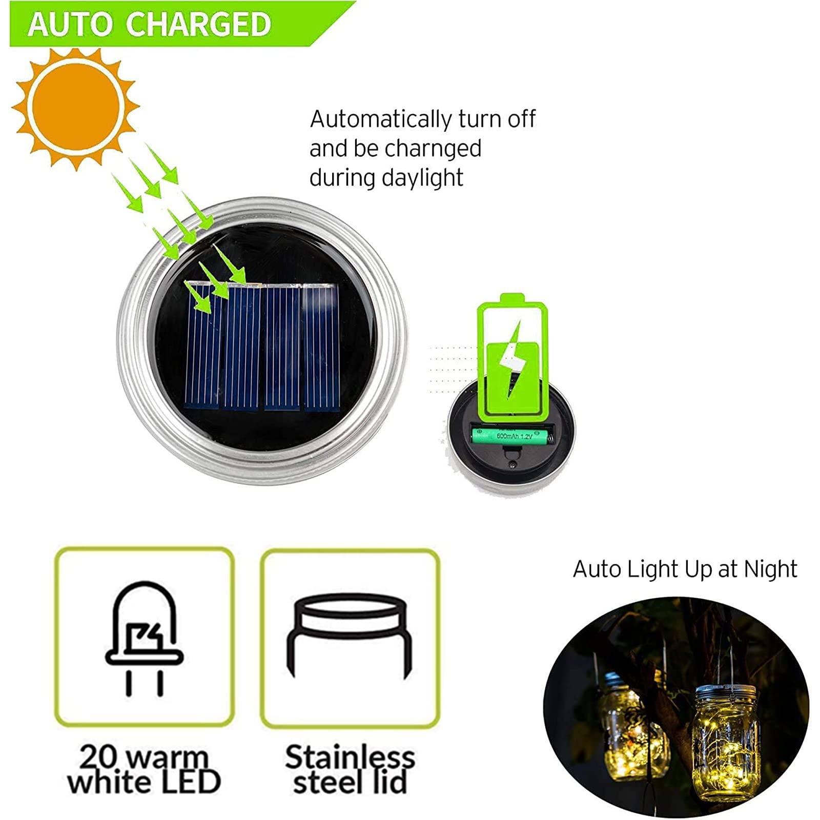 Magische Atmosphäre für deinen Garten! Dieses 3er Pack Solar-Mason-Jar-Lichter erzeugt eine wunderschöne warmweiße Beleuchtung. Jede Lichterkette hat 20 LEDs auf 2 Meter Länge. Mit Solardeckel (7 cm Durchmesser) - einfach auf ein Einmachglas stecken (Glas nicht im Lieferumfang). Lädt tagsüber 8 Stunden auf und leuchtet dann bis zu 10 Stunden. Aus Zinn und Kunststoff, wetterfest für den Außenbereich. Perfekt für die Dekoration von Terrasse, Garten, Balkon oder auch im Wohnzimmer. Schafft eine gemütliche Atmosphäre für romantische Abende oder Feste. Einfach in die Sonne stellen und abends den Zauber genießen. Das perfekte Geschenk für alle, die gemütliche Lichtstimmungen lieben!