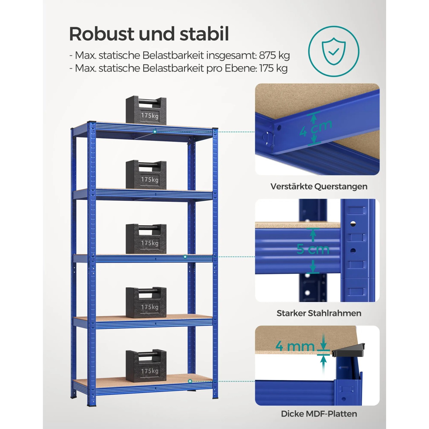 Riesig viel Stauraum für Garage, Keller oder Werkstatt! Dieses 3er Set Schwerlastregale bietet Platz ohne Ende. Jedes Regal misst 40x90x180cm und hat 5 höhenverstellbare Böden - alle 3cm anpassbar. Unglaubliche 875kg Gesamttragkraft (175kg pro Boden)! Aus verzinktem Stahl und robusten MDF-Platten, rostresistent und extrem stabil. Mit Kippschutz für Wandbefestigung und 8 Fußpads zum Bodenschutz. Einfache Montage ohne Schrauben - zwei Personen brauchen nur wenige Minuten. Endlich Ordnung im Chaos - ob für Werkzeuge, Vorräte oder schwere Geräte!
