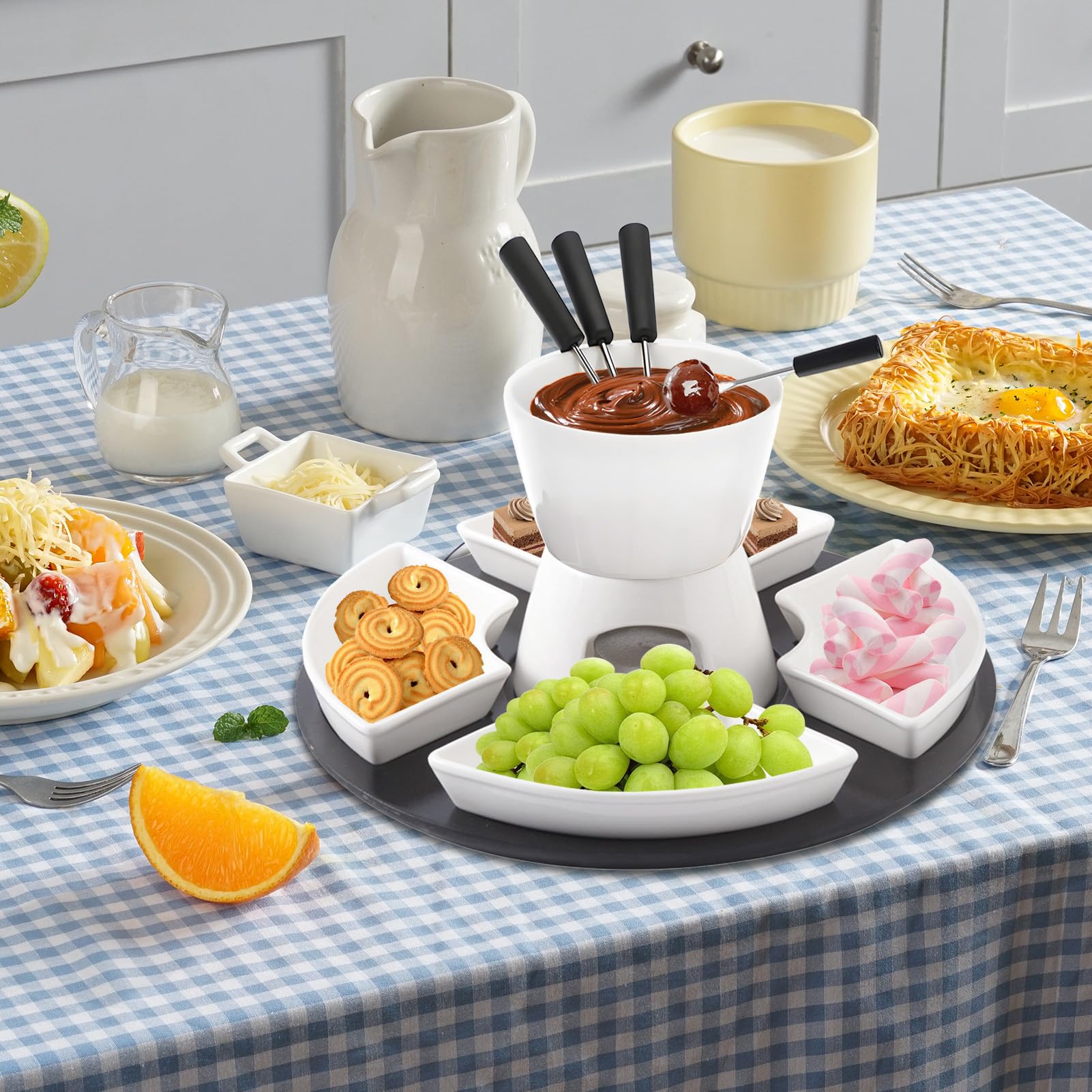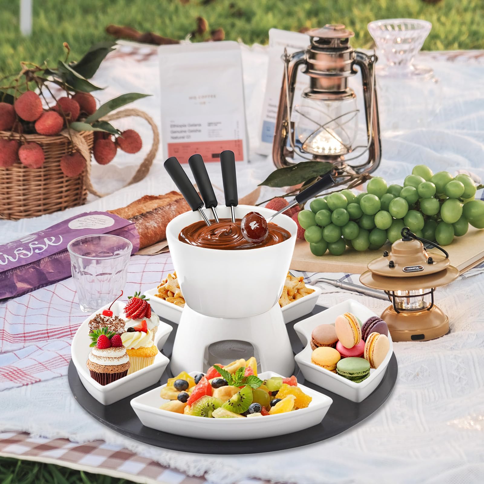 Wow, was für ein geniales Fondue-Set! Perfekt für gemütliche Abende zu zweit oder lustige Partys mit Freunden. Das Keramik-Set kommt komplett mit Schmelztopf, 4 Tellern, 4 Gabeln und einem stylischen Servierbrett. Du kannst nicht nur Schokolade schmelzen, sondern auch Käsefondue oder Karamell machen - der Kreativität sind keine Grenzen gesetzt! Die hochwertige Keramik ist super einfach zu reinigen und verhindert, dass was anklebt. Ohne Strom - einfach Kerzen untersstellen und loslegen. Super praktisch für drinnen und draußen. Macht sich auch mega als Geschenk zu Weihnachten, Valentinstag oder Hochzeiten. Dein neuer Party-Hit ist da!