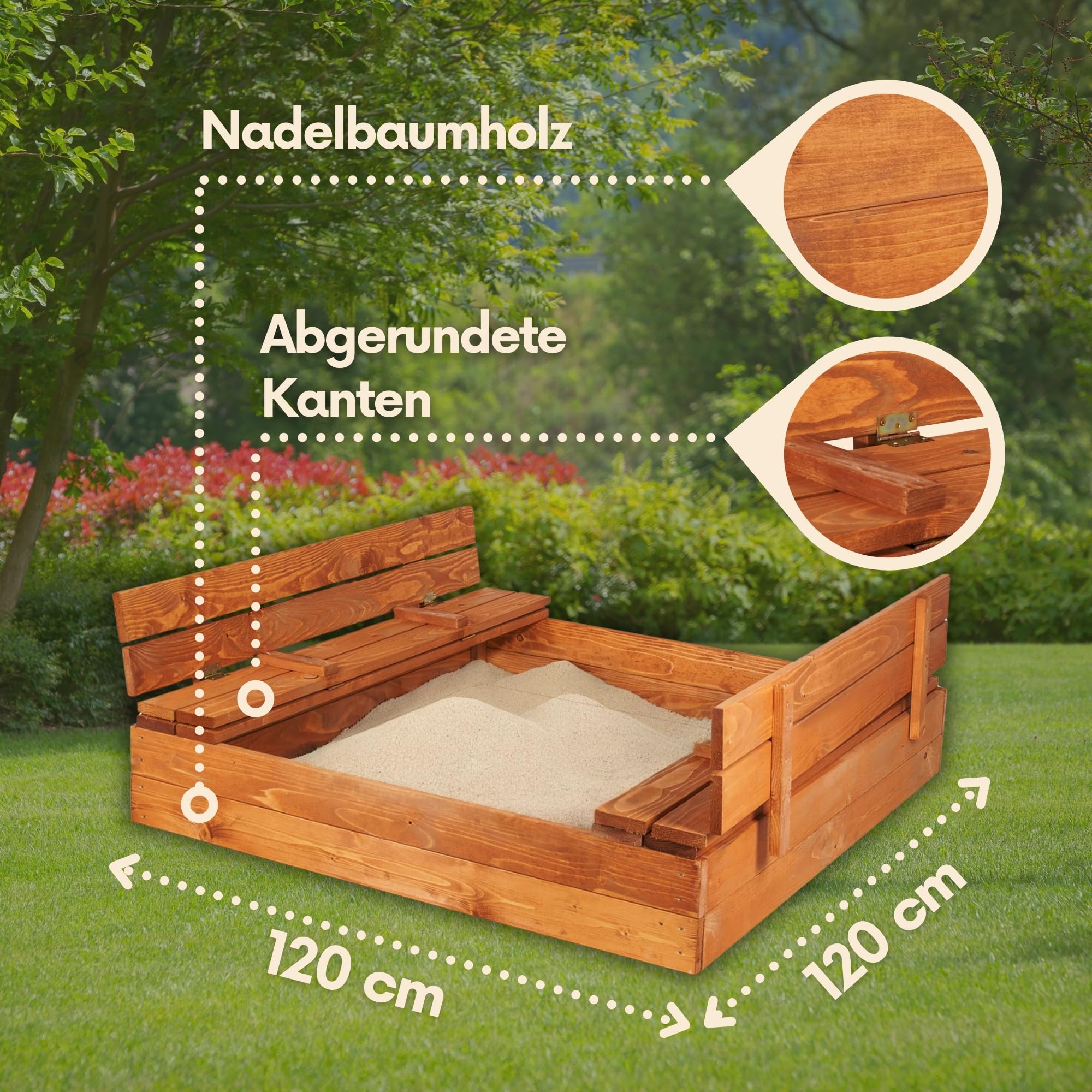 Der perfekte Sandkasten für kleine Baumeister! Aus natürlichem Zedernholz gefertigt, das robust, witterungsbeständig und langlebig ist. Mit 126x126cm bietet er viel Platz für mehrere Kinder. Die 4 eingebauten Sitzbänke sind jeweils bis 30kg belastbar - praktisch für Pausen beim Sandburgenbau. Das bodenlose Design ermöglicht später auch die Nutzung als Pflanzkasten. Einfache Montage mit beiliegender Anleitung und allem notwendigen Zubehör. Verdeckte Schrauben sorgen für maximale Sicherheit. Schafft einen tollen Spielbereich im Garten und fördert die Kreativität der Kinder. Ein Spielspaß für Jahre!