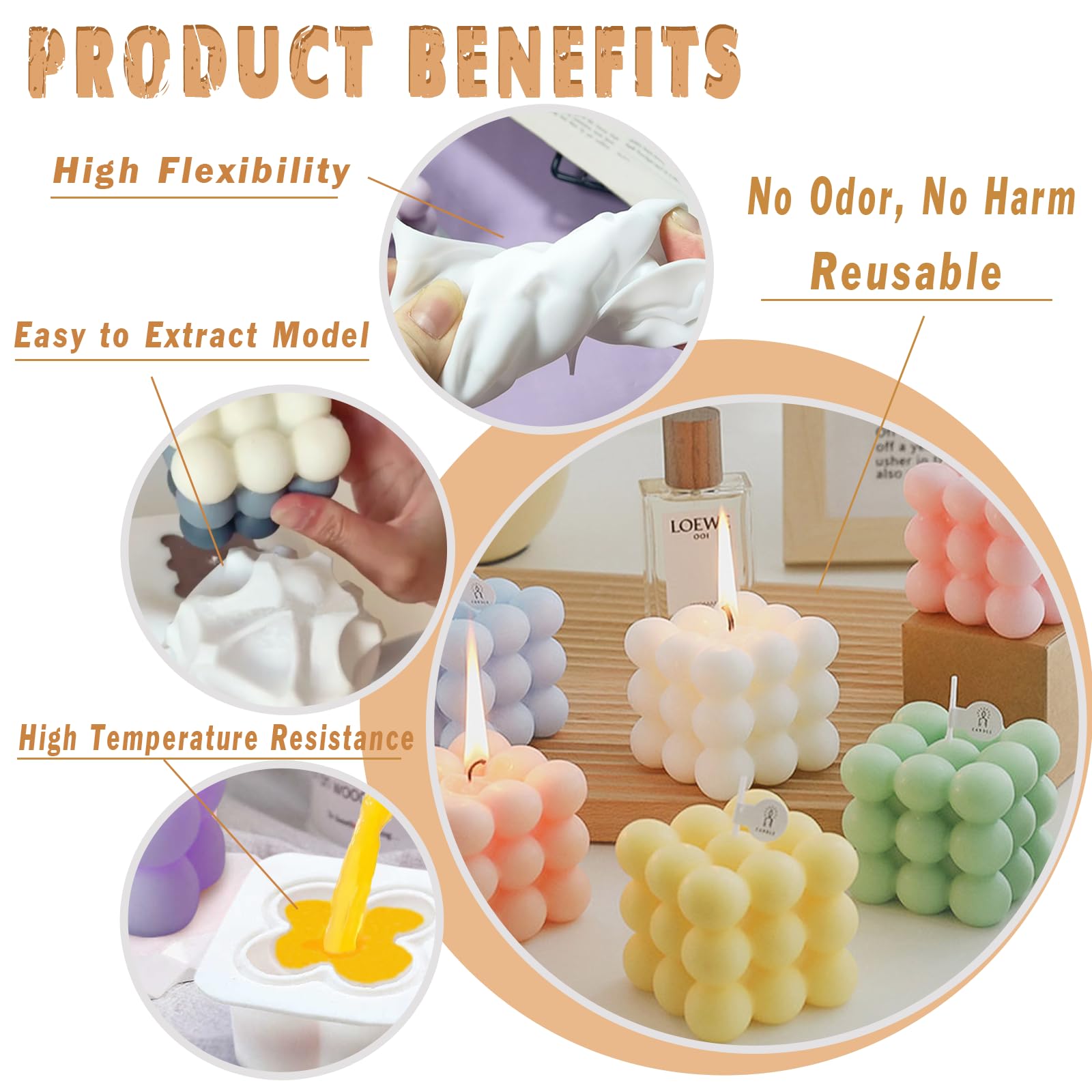 Mega cooles 4-teiliges Silikonform-Set für alle Bastelfans! Da kriegst du gleich vier verschiedene Formen: große Blasenform, kleine Blasenwürfelform, Diamantwürfelform und Spiralkerzenform - alles aus 100% lebensmittelechtem Silikon. Die Oberfläche ist superglatt mit Antihaft-Beschichtung, da löst sich alles easy raus. Hitze von -40°C bis 230°C? Kein Problem! Kann in Backofen, Spülmaschine und sogar Gefrierschrank verwendet werden. Die 3D-Formen geben deinen Kreationen eine richtig coole, dreidimensionale Optik - ob Kerzen, Seifen oder Backwaren. Einfach mit warmer Seifenlauge reinigen oder in die Spülmaschine stecken. Perfekt für Duftkerzen aus Sojawachs, aber auch für Mousse-Kuchen, Gebäck, Gelees, Brownies, Käsekuchen, Pralinen und Pudding. Ein absolutes Must-Have für alle, die gerne kreativ sind und individuelle Deko oder Leckereien herstellen wollen!