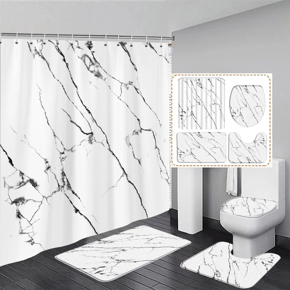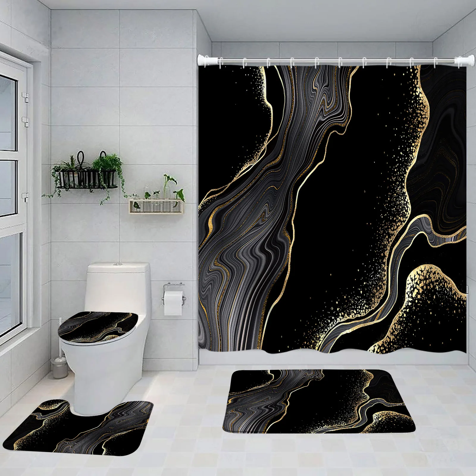 Verwandle dein Badezimmer in eine Luxus-Oase! Dieses 4-teilige Set bringt sofort stylisches Marmor-Design in dein Bad. Enthalten sind: ein riesiger Duschvorhang (183x183 cm), eine große Badematte (80x50 cm), ein U-förmiger Teppich für die Badewanne und ein praktischer WC-Deckelbezug. Der Duschvorhang aus Polyester ist komplett wasserdicht, während die Teppiche mit ihrer rutschfesten PVC-Unterseite für Sicherheit sorgen. Die goldenen Adern auf dem schwarzen Marmor-Design sehen einfach mega edel aus! Alles ist maschinenwaschbar - einfach kalt waschen und aufhängen zum Trocknen. Mit den 12 beiliegenden Duschvorhanghaken ist die Montage ein Kinderspiel. Perfekt als Geschenk oder um deinem Badezimmer diesen besonderen Luxus-Look zu verleihen. Sieht aus wie teures Hotel-Feeling, ist aber super praktisch im Alltag!
