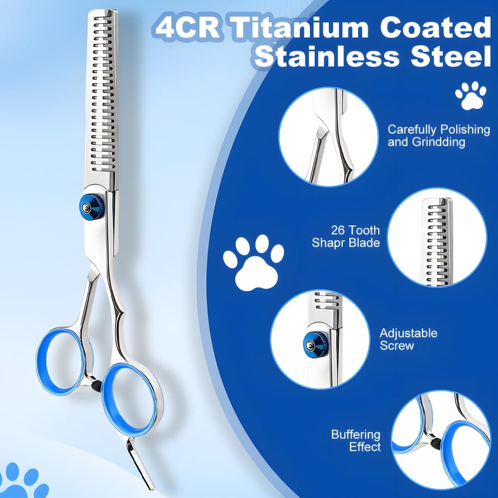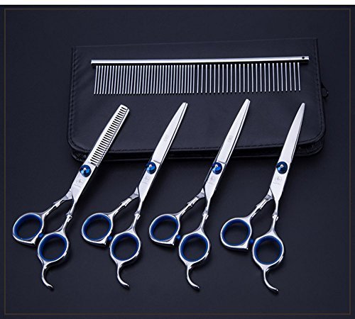 Komplettes Profi-Set für die Haustier-Fellpflege zu Hause! Enthält alles, was du brauchst: 1 Effilierschere, 1 gerade Schere, 1 gebogene Schere und 1 Fellpflegekamm. Aus hochwertigem Edelstahl mit Titanbeschichtung - super scharf und rostfrei. Die ergonomischen Griffe mit rutschfesten Silikonringen liegen perfekt in der Hand, auch bei längerem Gebrauch. Mit verstellbarer Schraube für individuellen Schnittwiderstand. Perfekt für sensible Stellen wie Augen, Ohren, Nase und Pfoten. Viel leiser als elektrische Trimmer - dein Haustier bleibt entspannt. Fingerringe abnehmbar für verschiedene Handgrößen. Spare Geld für den Hundefrisör und pflege deinen Liebling bequem daheim. Auch super für Katzen geeignet! Einfach zu reinigen und lange haltbar. Perfektes Geschenk für alle Tierbesitzer - auch Anfänger kommen super damit zurecht!