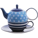 Teeliebhaber aufgepasst! Dieses wunderschöne Tea-for-one Set von teemando macht jede Teepause zum Erlebnis. Im 4-teiligen Set mit Kanne (0,45l), Tasse (0,25l), Sieb und Deckel.\\n\\nDas Besondere: Die Reactive Glaze Oberfläche! Jedes Set hat einzigartige, changierende Farbverläufe in frischem Blau - sieht aus wie handgemacht.\\n\\nDas integrierte Edelstahlsieb und der Deckel sorgen für perfekten Teegenuss. Einfach Teeblätter ins Sieb, heißes Wasser drauf und ziehen lassen.\\n\\nSuper als Geschenk für Teefans oder einfach für dich selbst. Perfekt für eine Person - ob morgens zum Wachwerden oder abends zum Entspannen.\\n\\nHochwertige Keramik, die nicht nur gut aussieht, sondern auch lange hält. Ein echter Hingucker in deiner Küche!