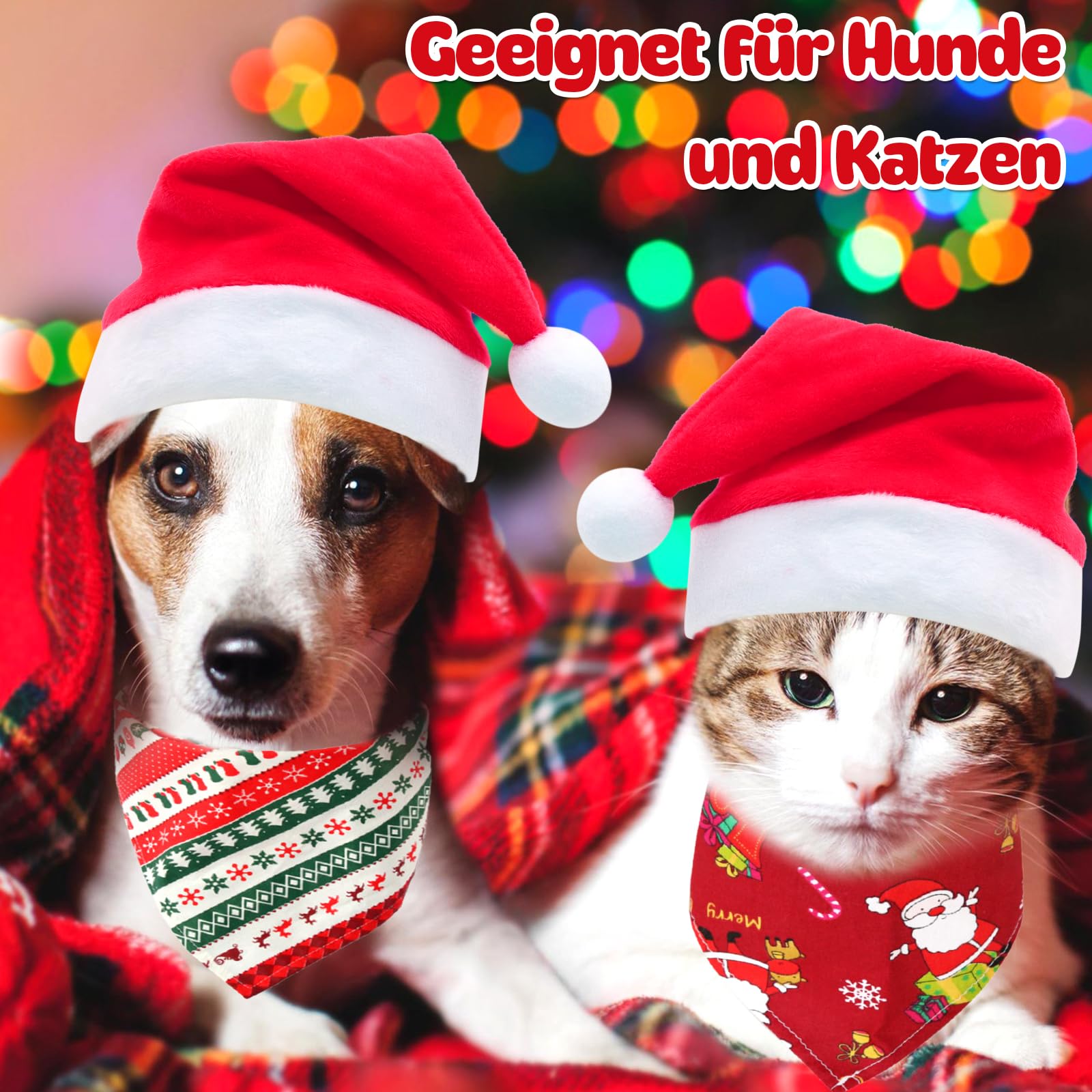 Mach deinen Hund zum Weihnachtsstar! Dieses süße 4-teilige Set verwandelt deinen Vierbeiner in die perfekte Weihnachtsdekoration. Enthalten sind 2 weihnachtliche Halstücher und 2 niedliche Nikolausmützen - genug für mehrere festliche Auftritte oder um mit mehreren Hunden zu feiern. Die Halstücher sind aus weichem, hautfreundlichem Material gefertigt, das atmungsaktiv ist und sich leicht reinigen lässt. Die Mützen haben ein verstellbares Band für die perfekte Passform und bieten genug Platz für die Ohren deines Hundes. Ideal für kleine bis mittelgroße Hunde. Die klassischen Weihnachtsfarben und festlichen Motive sorgen für die richtige Stimmung auf jeder Weihnachtsfeier. Einfach um den Hals binden oder die Mütze aufsetzen - und schon ist dein Hund bereit für die Weihnachtsfotos! Das Set ist auch eine super Geschenkidee für Hundebesitzer. Leicht zu pflegen und waschbar, damit der Weihnachtsspaß lange anhält. Dein Hund wird der Hit auf jeder Weihnachtsfeier sein!