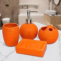 Bring Farbe ins Bad mit diesem stylischen 4-teiligen Badezimmer-Set in kräftigem Orange! Alles aus hochwertiger Keramik: Seifenschale, Seifenspender, Zahnbürstenhalter und Zahnputzbecher. Das moderne Design macht aus jedem Bad einen Hingucker. Super praktisch und dekorativ zugleich. Die Oberfläche ist leicht zu reinigen und pflegeleicht. Perfekt aufeinander abgestimmt - so sieht alles gleichmäßig und ordentlich aus. Ob im Gäste-WC, Familien-Bad oder der eigenen Wohnung - dieses Set bringt sofort frischen Wind ins Badezimmer. Einfach auspacken und hinstellen - schon hast du ein komplett neues Bad-Gefühl! Auch ein tolles Geschenk für alle, die ihr Zuhause verschönern wollen.