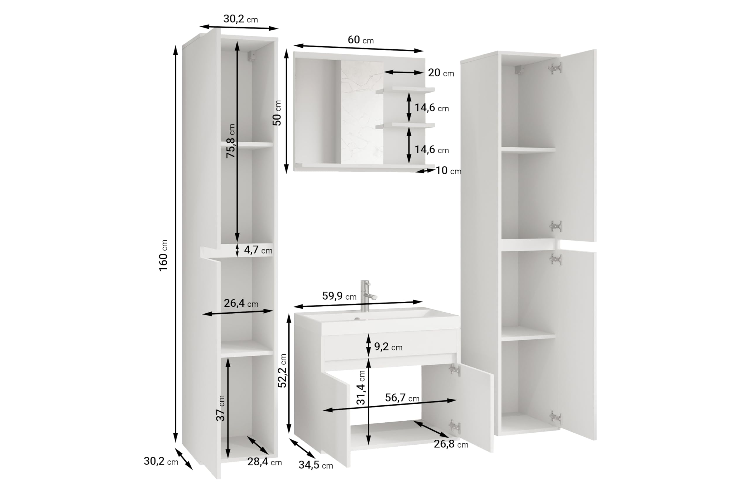MINIO Badmöbel Set Capri 4-tlg. - Waschbecken Mit Unterschrank 60cm & 2 Hängeschränke