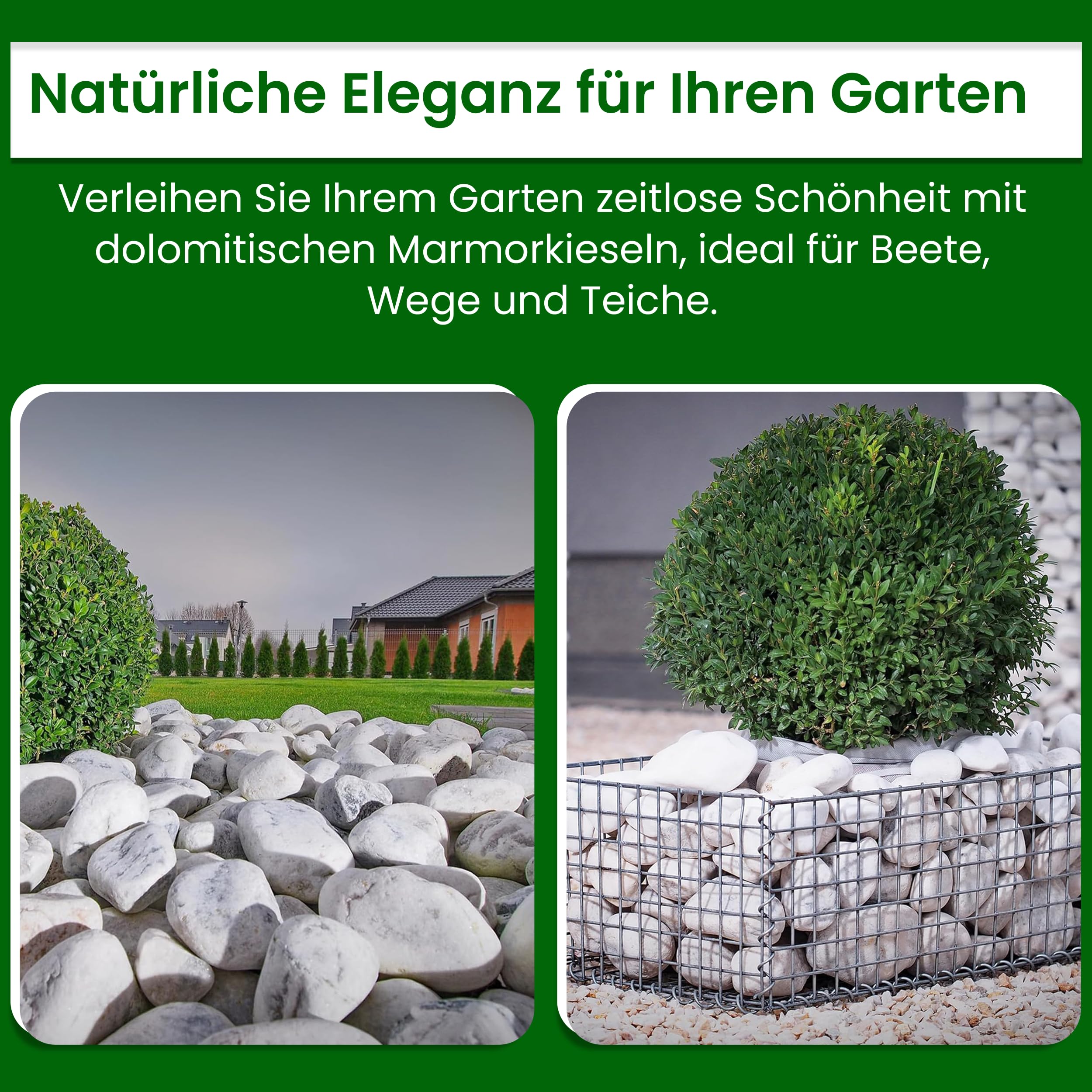 Willst du deinem Garten einen frischen Look verpassen? Diese weißen Kieselsteine in 40-60 mm Körnung sind genau das Richtige! Aus dolomitischem Gestein gefertigt, erinnern sie an natürliche Flusssteine - nur in schönem, hellem Weiß. Perfekt für Beete, Wege oder als dekorative Elemente.