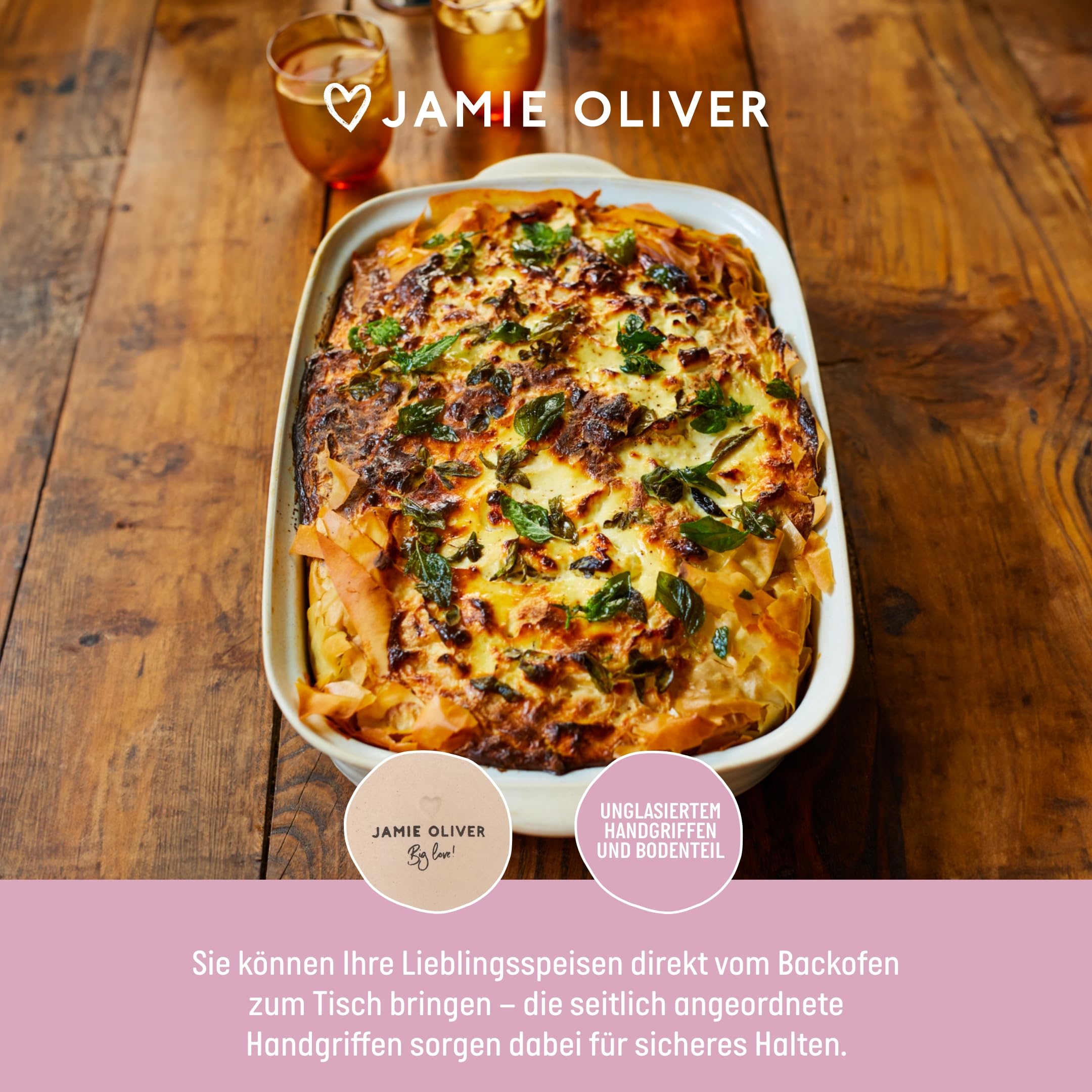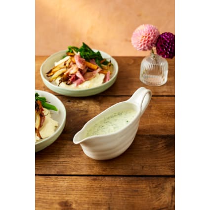 Soßen servieren wie ein Profi! Diese Jamie Oliver Big Love Sauciere aus robustem Steingut macht jede Mahlzeit eleganter. Mit 400ml Fassungsvermögen ist sie perfekt für Soßen, Dips, Dressings oder auch als praktischer Messbecher (1, ½, ¼ Tassen). Der gekniffene Ausguss und der bequeme Griff machen das Einschenken zum Kinderspiel - keine Tropfen daneben! Die organische, gesprenkelte und gerippte Struktur mit rauem Fuß verleiht ihr einen besonderen Charme. Und das beste: Sie ist spülmaschinen-, ofen- und mikrowellengeeignet - also super pflegeleicht. Durch das stapelbare Design sparst du Platz in der Küche. Ob für den eigenen Haushalt oder als Geschenk - diese Sauciere von Jamie Oliver ist ein echter Hingucker auf jedem gedeckten Tisch. Einfach befüllen, auf den Tisch stellen und deine Gäste werden begeistert sein!