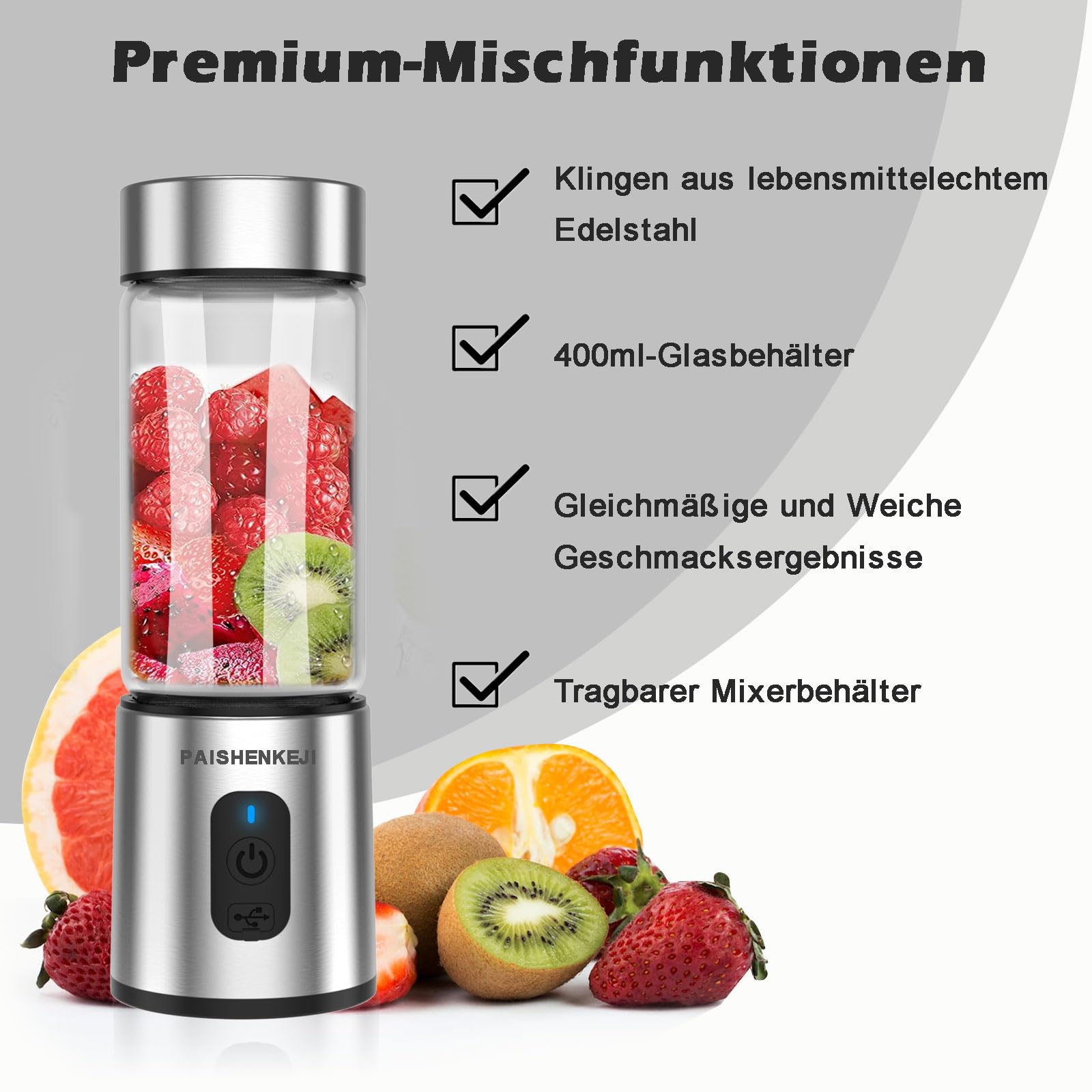 400 ml Fassungsvermögen aus Borosilikatglas. 6 Edelstahl-Klingen mit 18.000 U/min - in 30 Sekunden ist dein Drink fertig! 1500 mAh Akku mit USB-C - lädt überall.