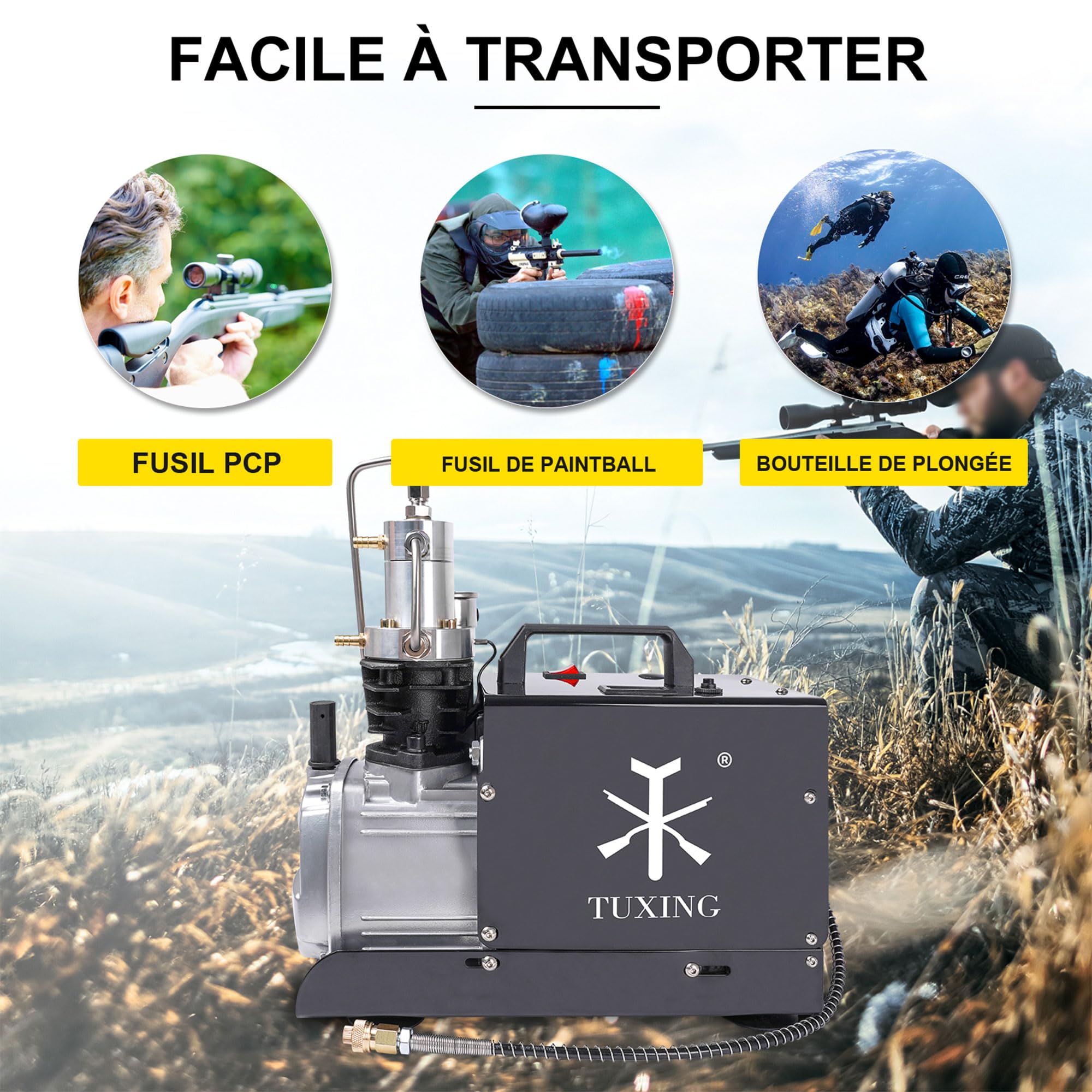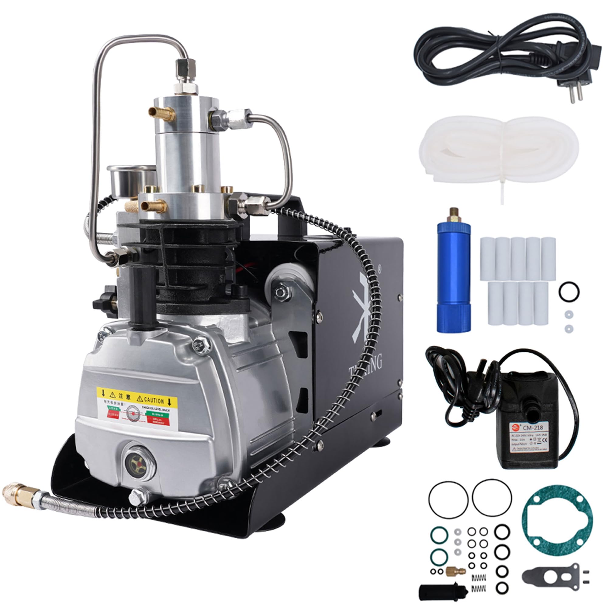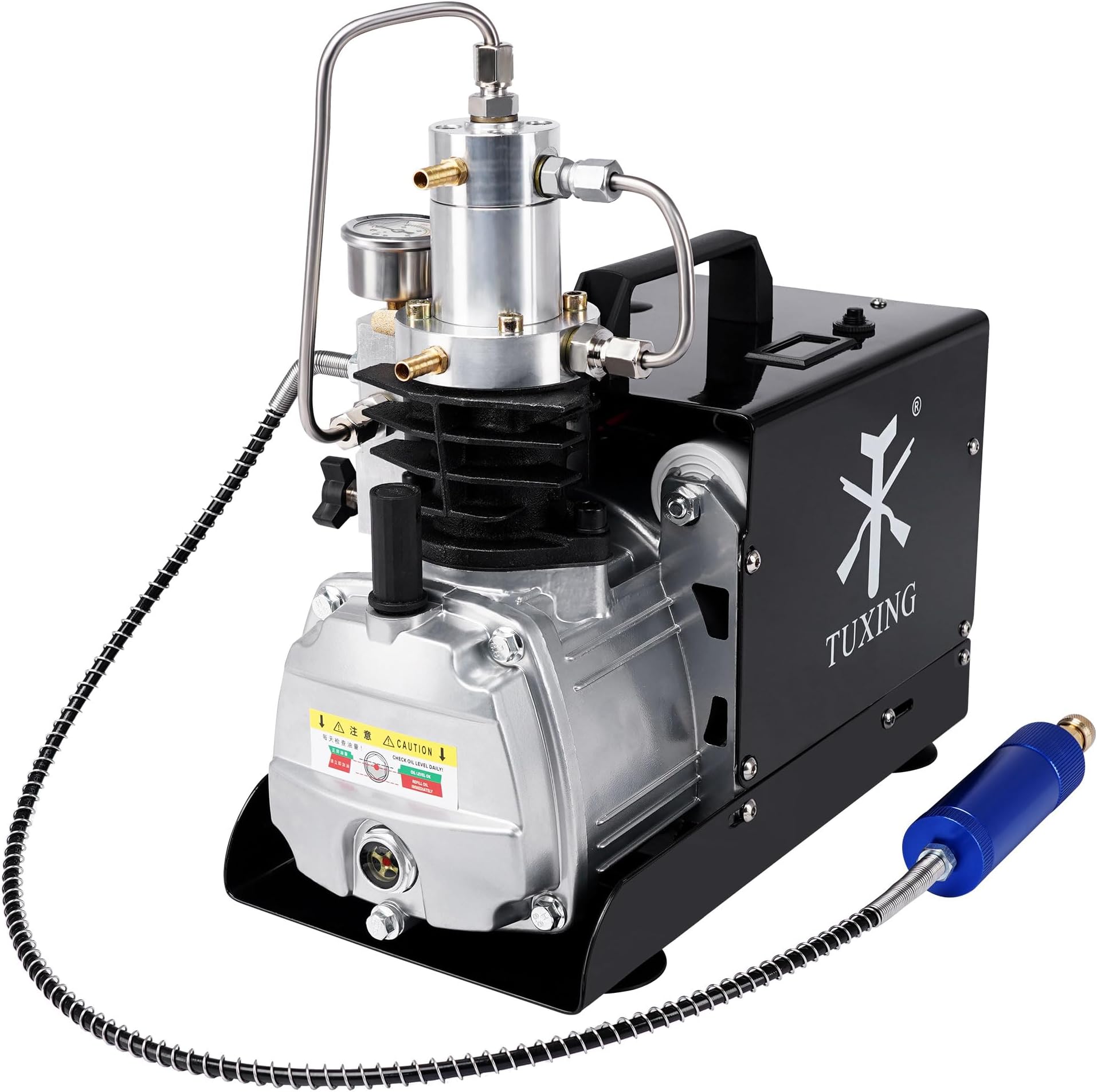 Schluss mit mühsamem Pumpen! Der TUXING Kompressor bringt's richtig auf den Punkt: Volle 4500 PSI (30 MPa) Druck für deine Tauch- oder Paintball-Flaschen. Mit 1800W Power und zweistufiger Kompression füllst du eine 0,5l Flasche in nur 5 Minuten - mega schnell! Das Wasser-Lüfter-Kühlsystem hängt die Temperatur im Griff, sodass der Kompressor nicht überhitzt. Einfach Kühlwasser in einen Eimer füllen, anschließen und los geht's! Wichtig: Bitte nur mit Silikonöl betreiben (nicht im Lieferumfang enthalten) und die Laufzeit von 45 Minuten nicht überschreiten. Perfekt für Taucher, Paintball-Spieler und alle, die hochwertige Druckluft benötigen. Achtung: 220V Version - nur für Haushaltssteckdosen geeignet!