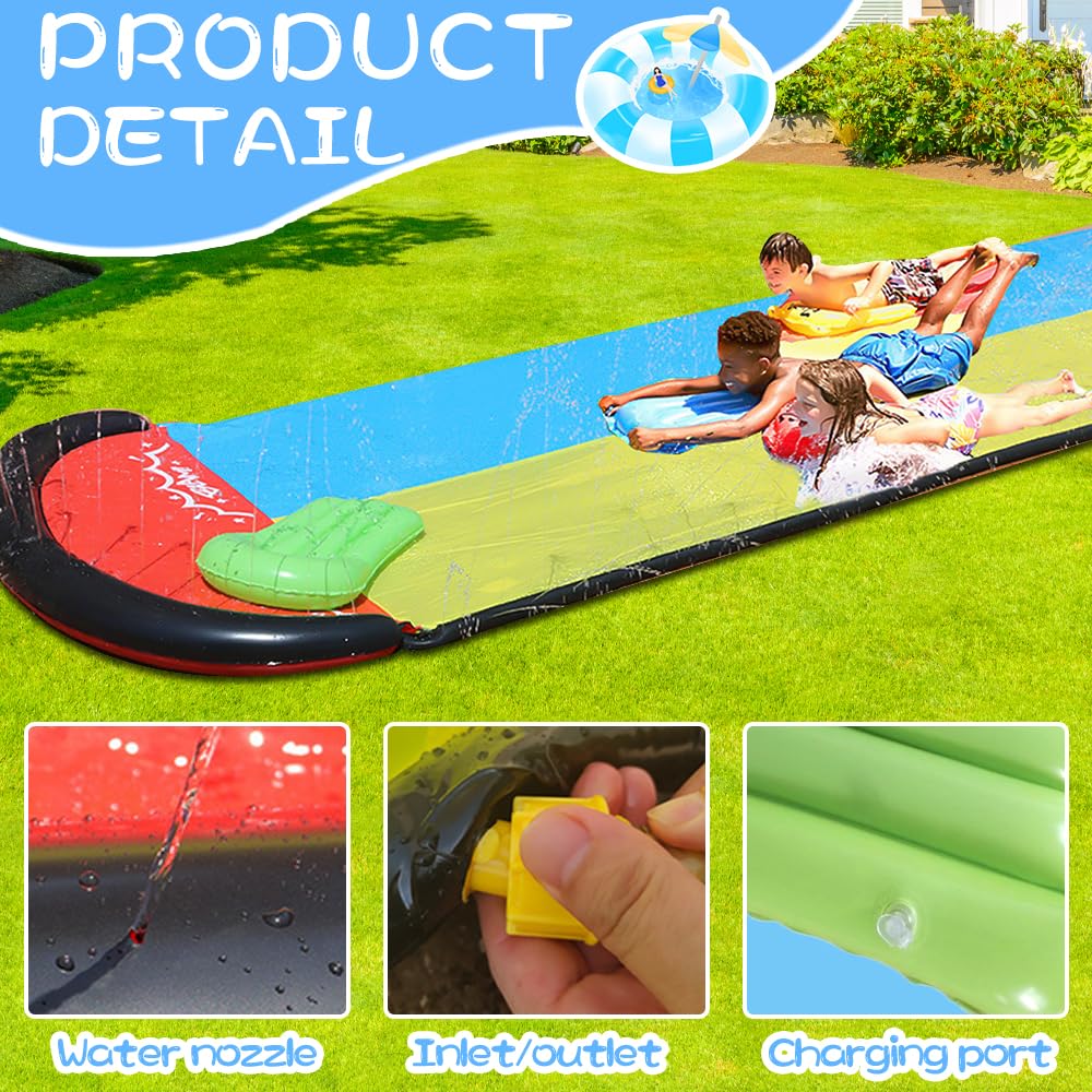 Sommer, Sonne, Wasserrutschen-Spaß! Diese riesige Wasserrutsche mit 488 cm Länge und 85 cm Breite bringt Abkühlung an heißen Tagen. Aus robustem PVC-Material, hält auch wildem Rutschen stand. Mit integriertem Sprühsystem - einfach Gartenschlauch anschließen und die Rutsche wird automatisch nass. Inklusive Bodyboard für extra Geschwindigkeit und 4 Bodennägeln für sicheren Halt. Perfekt für Gartenpartys, Geburtstage oder einfach nur für lustige Familien-Nachmittage. Einfach aufklappen, Wasser marsch und schon geht der Rutschspaß los. Der absolute Hit für Kinder von 5-12 Jahren!