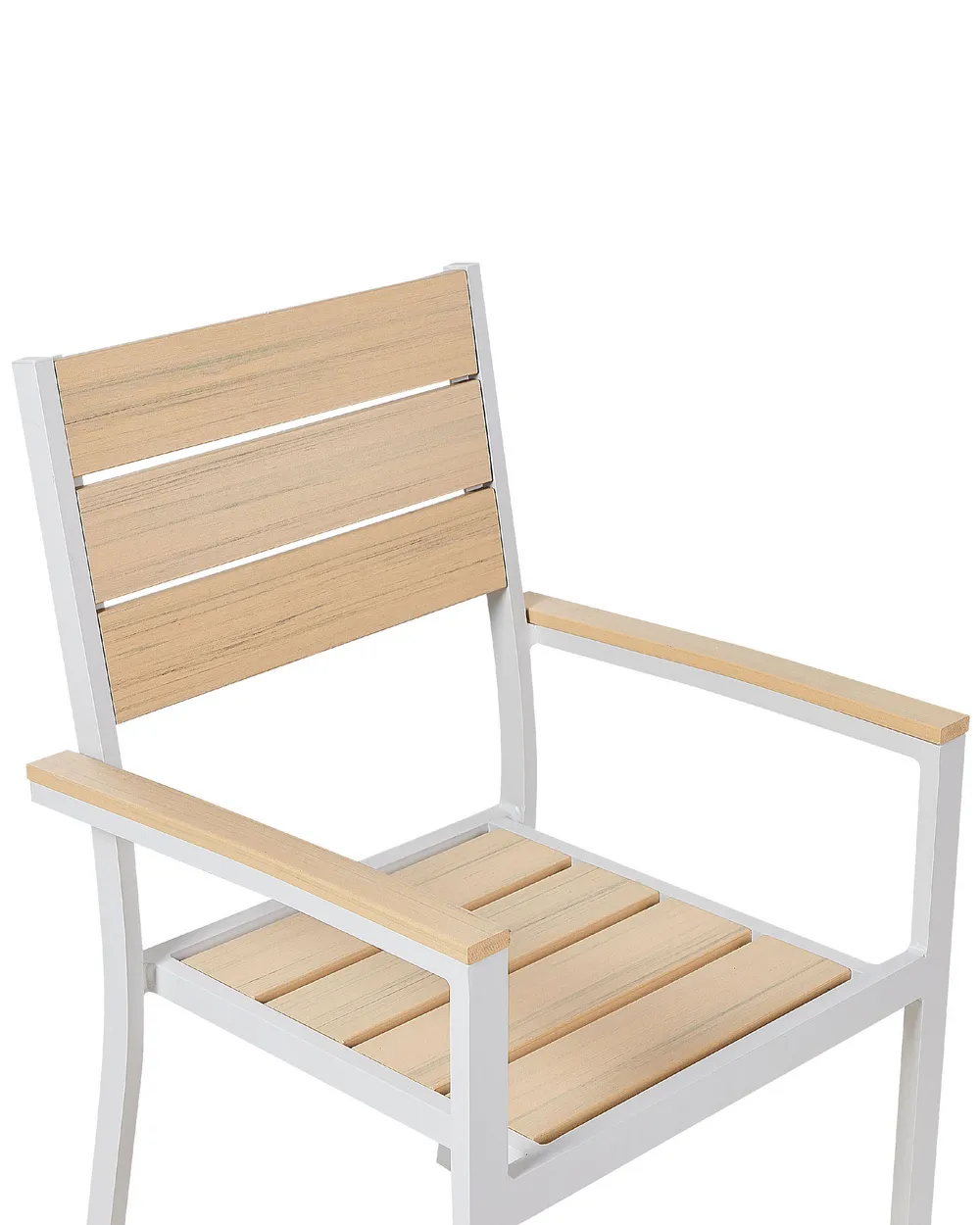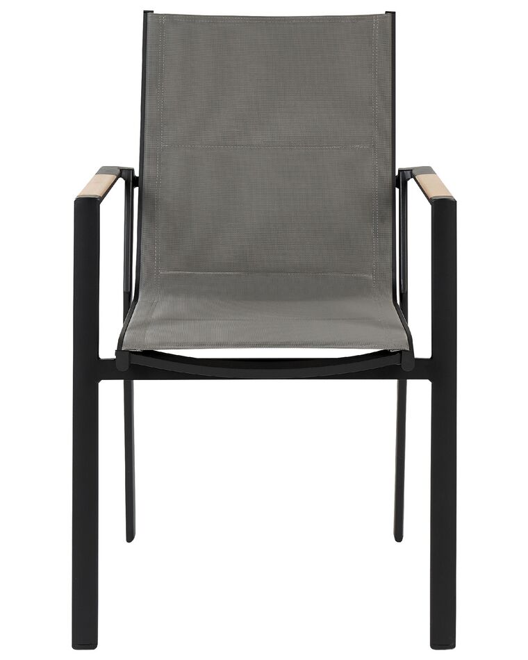Perfekte Sitzgelegenheit für deine Terrasse! Dieses 4er Set von Beliani besteht aus stylischen Gartenstühlen in schwarz-grau. Die Sitzflächen sind aus robustem Kunstholz, das Gestell aus pulverbeschichtetem Aluminium - absolut witterungsbeständig und pflegeleicht. Mit bequemen Armlehnen und einer Sitzhöhe von 42 cm super gemütlich. Jeder Stuhl hält bis zu 130 kg aus und ist stapelbar - praktisch wenn mal Platz gespart werden muss. Die Maße von 57x57x90 cm (BxTxH) passen in jeden Gartenbereich. Ohne Montage, sofort einsatzbereit! Ideal für Garten, Terrasse oder Balkon. Die Stühle sind wind-, wasser-, schmutz- und rostbeständig - machen also auch mal ein Regenschauer nichts aus. Einfach abwischen und fertig!