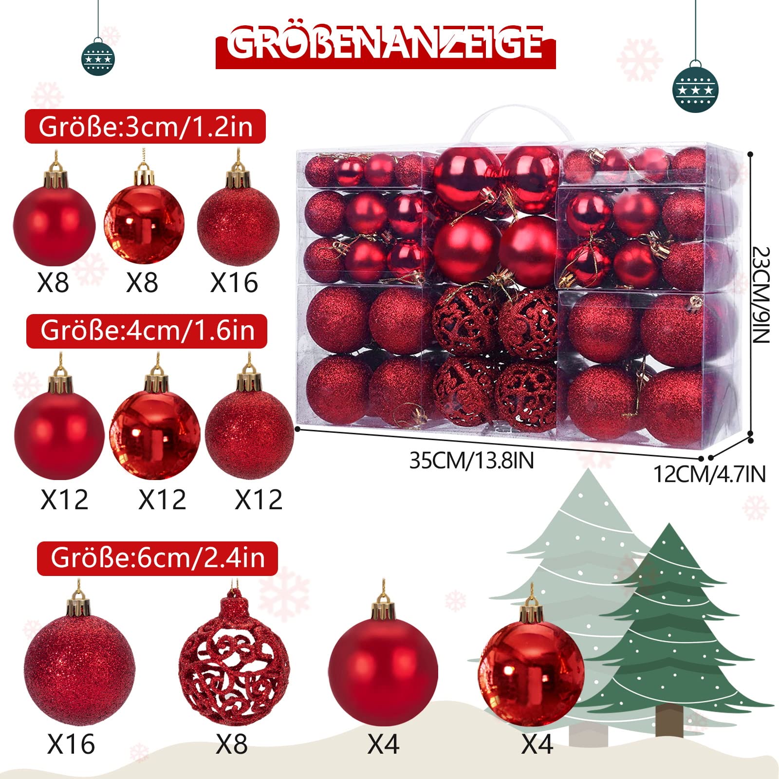 Weihnachtsschmuck der hält was er verspricht! Diese 4 bruchsicheren Weihnachtskugeln in kräftigem Rot bringen festliche Stimmung ohne Bruchgefahr. Mit 10cm Durchmesser sind sie ein echter Hingucker am Baum, im Fenster oder als Outdoor-Deko. Die Mischung aus matten und glänzenden Flächen sorgt für tollen Lichteffekt. Aus robustem Kunststoff - perfekt für Haushalte mit Kindern oder Haustieren. Mach dein Zuhause weihnachtlich sicher!