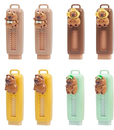 Wie süß sind denn diese Capybara Radiergummis! 4 Stück in verschiedenen Braun-Tönen - grün, gelb, hell- und dunkelbraun. Mit praktischem Push-Pull-Mechanismus - einfach drücken und der Radiergummi kommt raus. Aus weichem TPR-Material - radiert super sauber. Jeder etwa 10x2cm groß - passt in jedes Federmäppchen. Die niedlichen Tier-Motive machen Kindern Spaß am Radieren. Perfekt für Schule, Hausaufgaben oder Büro. Auch als kleines Geschenk oder Party-Mitgebsel super. Macht Fehler korrigieren zum Vergnügen. Einfach in die Tasche stecken und immer dabei haben. Kinder lieben diese verspielten Radiergummis!
