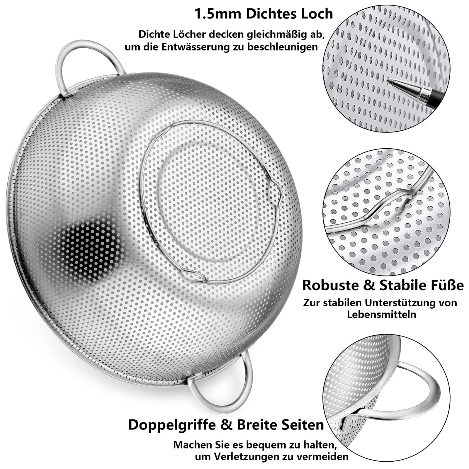 Die mikroperforierten Löcher sind der Hit - die sind so klein, dass selbst feine Lebensmittel wie Quinoa oder kleine Nudeln nicht durchfallen. Aber das Wasser läuft trotzdem super schnell ab. Viel besser als diese Plastik-Siebe, die schnell kaputt gehen!