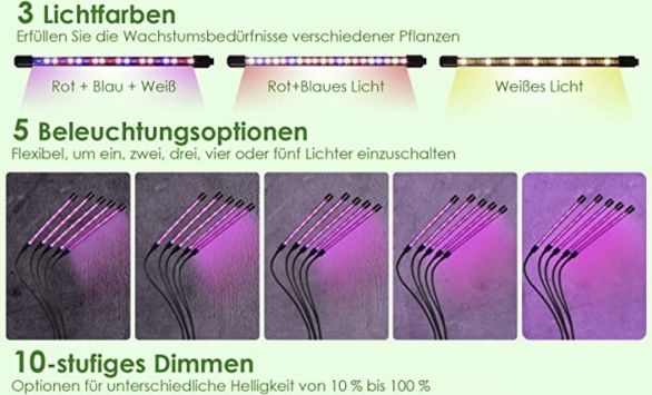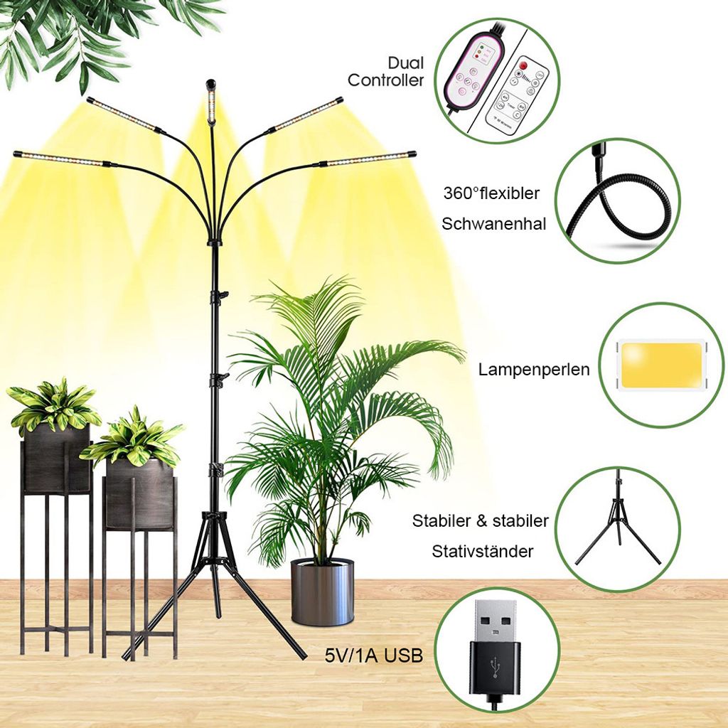 Deine Pflanzen werden's dir danken! Diese LED Pflanzenlampe mit 5 Köpfen ist ein echter Game-Changer für drinnen. Vollspektrum-Licht (400-700nm) - genau was Pflanzen für die Photosynthese brauchen. Mit Timer für 4, 8 oder 12 Stunden - du musst nicht mehr ans Ein- und Ausschalten denken. Die 360° Schwanenhälse sind super flexibel - du kannst jede Pflanze genau anstrahlen. Höhenverstellbar von 40-160cm - passt für alle Pflanzenhöhen. Mit Fernbedienung - bequem von der Couch aus steuerbar. 3 Beleuchtungsmodi für Wachstum, Blüte und Frucht. Energiesparend und umweltschonend. Deine Kräuter, Blumen und Gemüsepflanzen werden üppig wachsen - auch ohne Sonnenlicht!