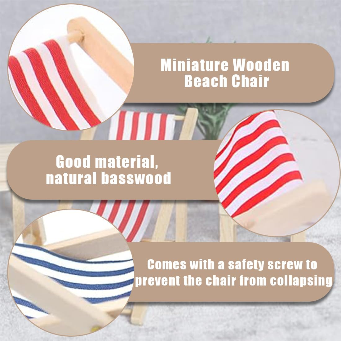 Wie süß sind die denn?! Dieses Set mit 5 mini Liegestühlen aus Holz bringt Urlaubsfeeling ins Zimmer. Mit blau-weißem Stoffsitz, nur ca. 11×5 cm groß - perfekt für Puppenhäuser, Terrarien oder Deko-Projekte. Super detailliert und stabil verarbeitet. Du kannst sie sogar als Handyhalter verwenden! Die Liegestühle sind klappbar - mega platzsparend. Ideal für kreative Fotos, Kinder-Spiele oder als Geschenk für DIY-Fans. Mach dir deine eigene Mini-Strandoase! Ob auf dem Regal, im Glas oder als Tischdeko - diese kleinen Liegestühle sorgen für ganz großen Spaß!