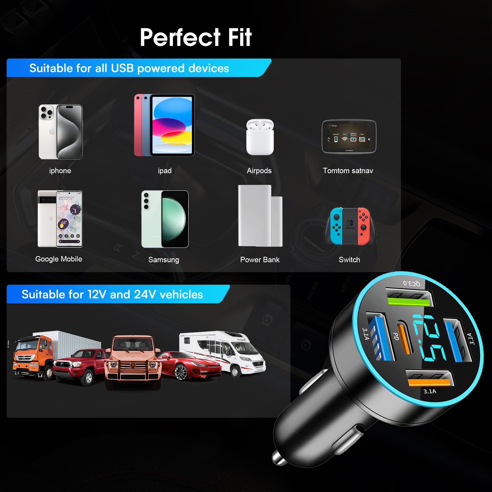 Schluss mit Lade-Chaos im Auto! Dieses 5-Port USB C Auto Ladegerät mit satten 66W Leistung lädt bis zu 5 Geräte gleichzeitig - perfekt für Familien, Roadtrips oder Geschäftsleute. Mit 30W PD, 18W QC3.0 und 15.5W 3.1A Anschlüssen hast du für jedes Gerät den passenden Port! Das integrierte LED-Voltmeter zeigt dir permanent die Bordspannung an - so behältst du immer den Überblick über deine Autobatterie. Kompatibel mit so gut wie allem: iPhone 15/14/13/12 Serie, Samsung Galaxy S22/S21, Google Pixel, Huawei, Xiaomi, Tablets, Kameras, Navigationsgeräte und mehr! Der kompakte Adapter (nur 30g schwer) nimmt kaum Platz weg und die einziehbaren Schalter sorgen für festen Sitz im Zigarettenanzünder. Das Advanced Intelligent Circuit Safety System schützt vor Kurzschluss, Überspannung, Überhitzung und Überstrom - maximale Sicherheit für deine teuren Geräte! Perfekt für 12V/24V Fahrzeuge - ob Auto, LKW oder Wohnmobil. Die verschiedenen Protokolle (PD3.0, QC3.0, AFC, FCP, SCP) garantieren immer die optimale Ladegeschwindigkeit für dein Gerät. Nie wieder streiten, wer zuerst laden darf - mit 5 Ports ist für alle gesorgt! Hol dir dieses Powerpaket für dein Auto und genieße entspanntes Laden auf allen Fahrten!