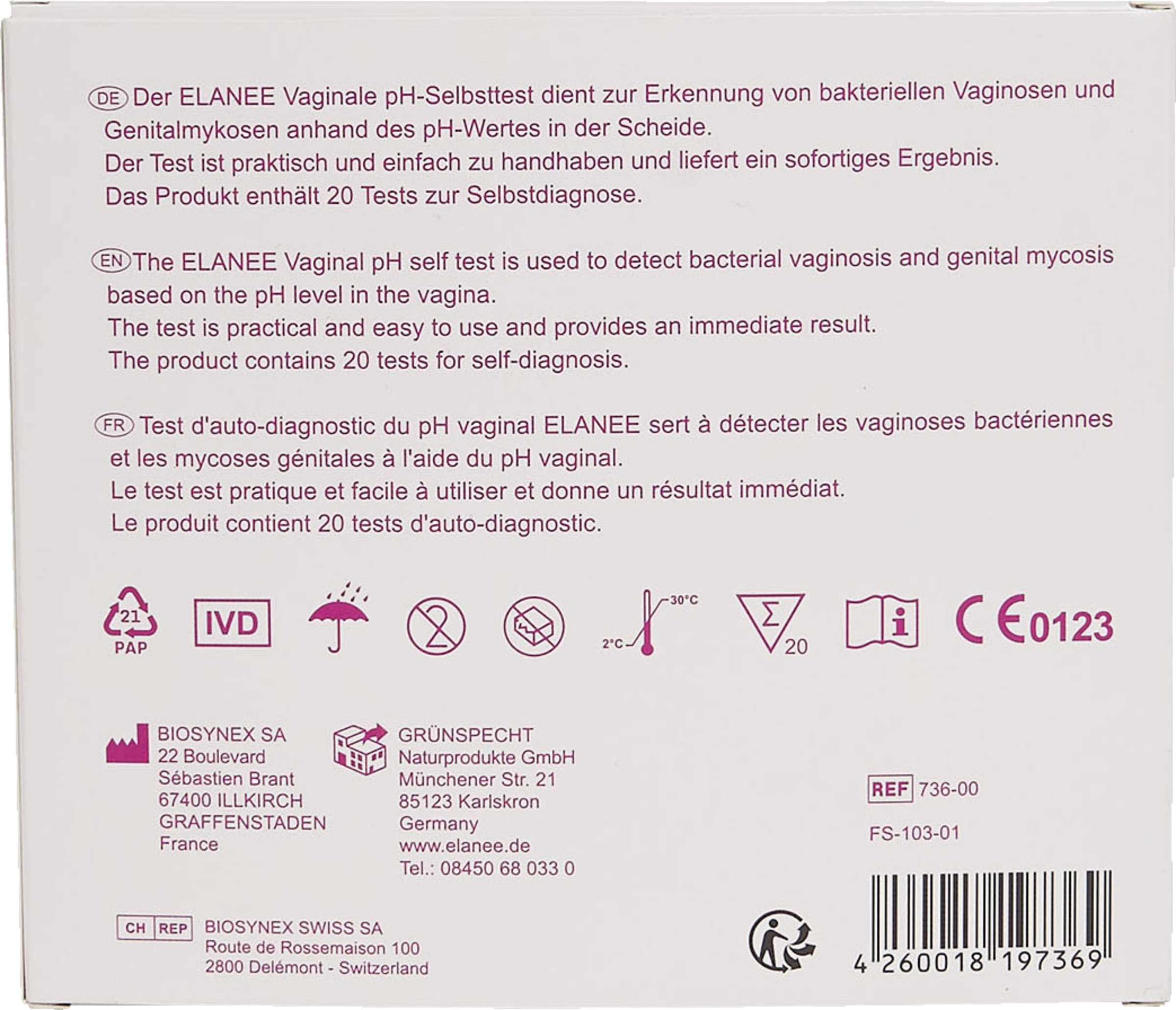 Mit bis zu 99% Genauigkeit vergleichbar mit Laborergebnissen. Einfach den Teststab 2-3 cm in die Scheide einführen, 10 Sekunden warten und das Ergebnis sofort ablesen. Diskret verpackt - niemand weiß, was im Paket ist. Wichtige Vorsorge für jede Frau!