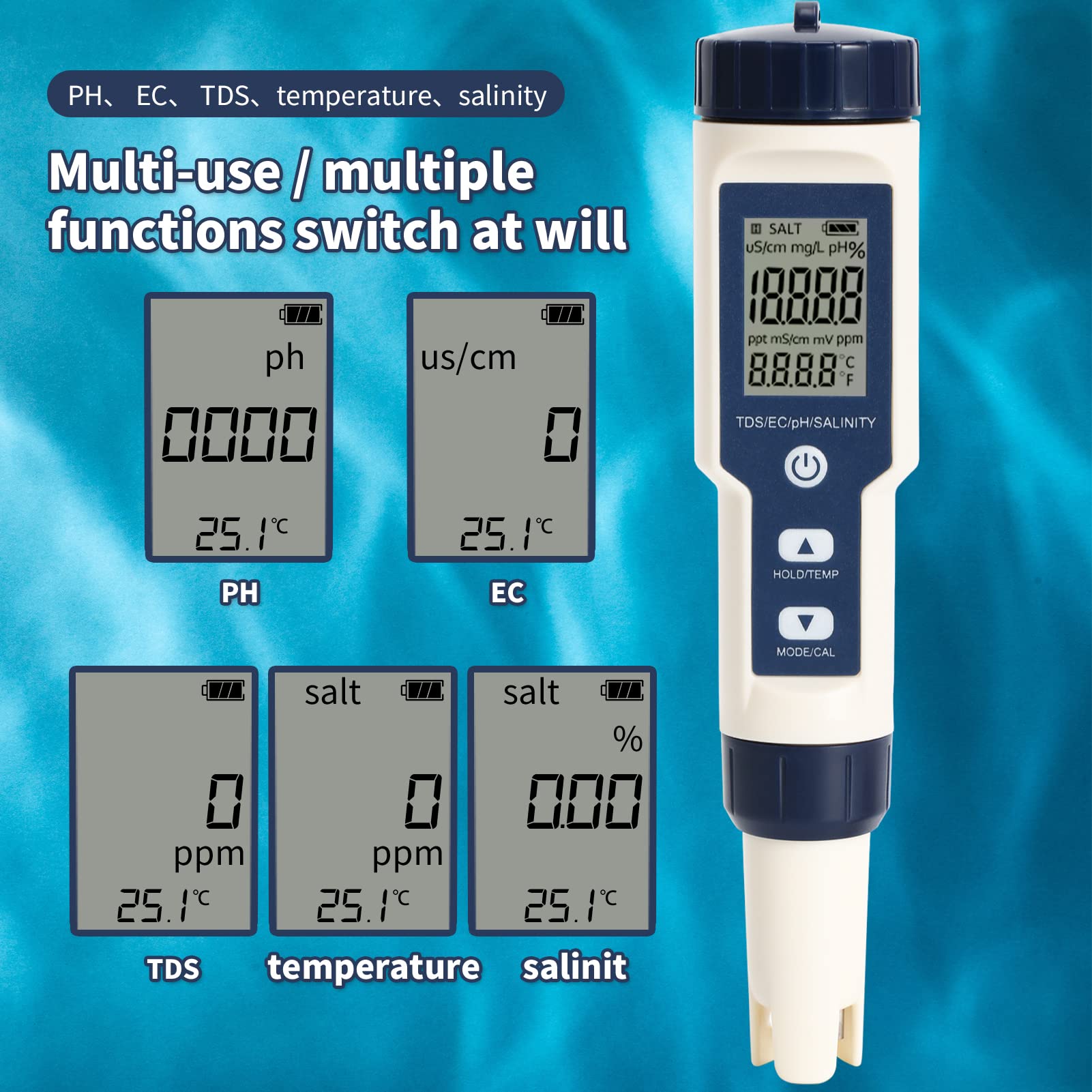 Professionelle Wasseranalysen ganz einfach - mit dem EZ-9909 5-in-1 Wasserqualitätstester! Dieses vielseitige Messgerät überprüft gleichzeitig PH-Wert, Salzgehalt, EC-Leitfähigkeit, TDS-Gesamtsalzgehalt und Wassertemperatur. Mit IP67 Wasserschutz kannst du es bedenkenlos im Aquarium, Pool oder anderen Gewässern verwenden. Das große LCD-Display mit Hintergrundbeleuchtung zeigt alle Werte klar und deutlich an, selbst bei schlechten Lichtverhältnissen. Die automatische Kalibrierung und Temperaturkompensation sorgt für präzise Messergebnisse. Besonders praktisch: Die austauschbare Sonde und die automatische Abschaltung nach 5 Minuten schonen die Batterie. Mit den Maßen 183x37x37mm ist das Gerät handlich und passt in jede Tasche. Perfekt für Aquarienbesitzer, Pool-Betreiber, Hydroponik-Anwender oder alle, die ihre Wasserqualität im Auge behalten wollen. Ein unverzichtbares Tool für Hobby und Profession - einfach messen und sofort Bescheid wissen über dein Wasser!